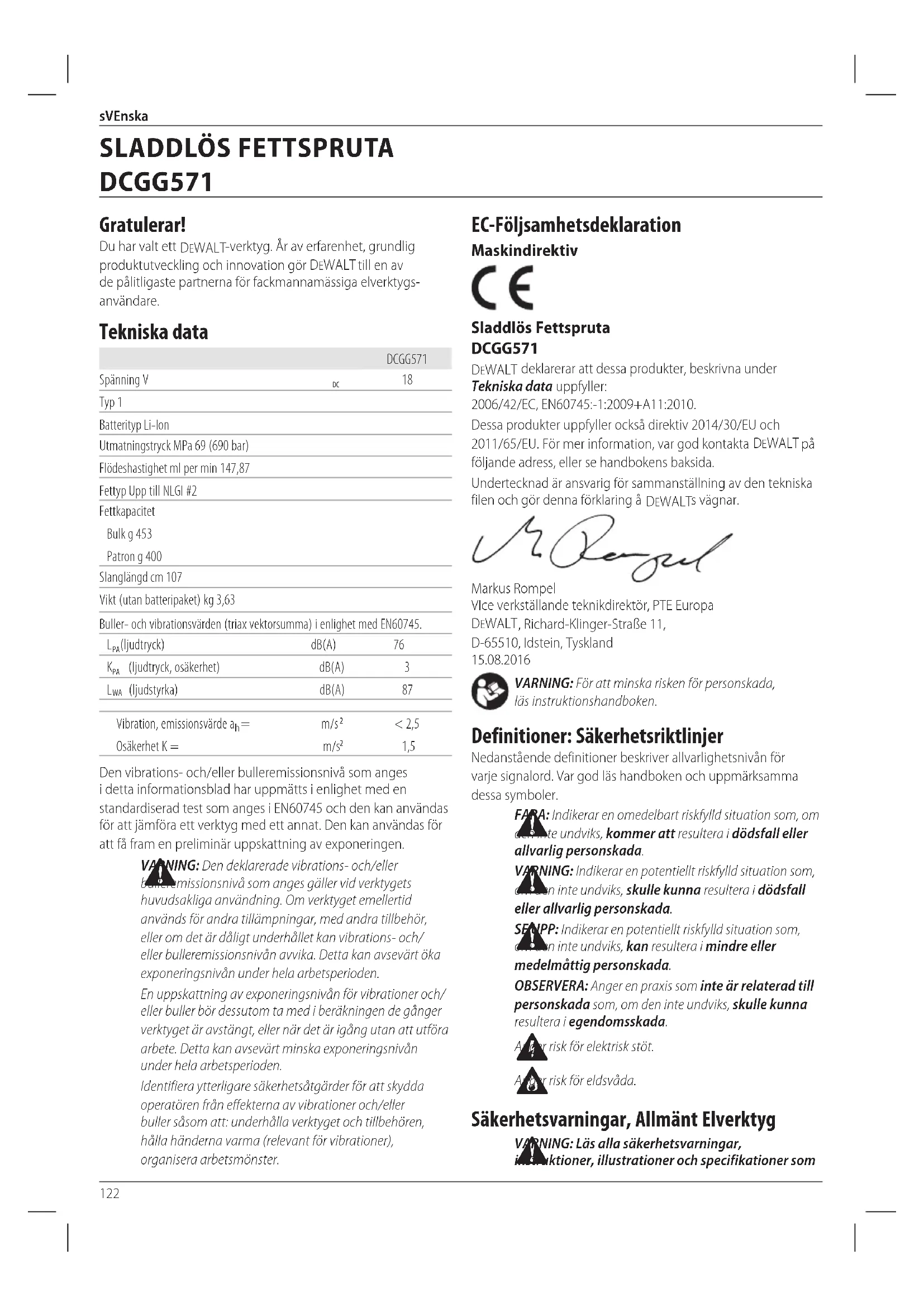 följande adress, eller se handbokensbaksida. Undertecknad är ansvarig för sammanställning av den tekniska filen och gör denna förklaring å DeWALT svägnar. Markus Rompel VIce verkställande teknikdirektör, PTE Europa DeWALT , Richard-Klinger-Straße 11, D-65510, Idstein, Tyskland