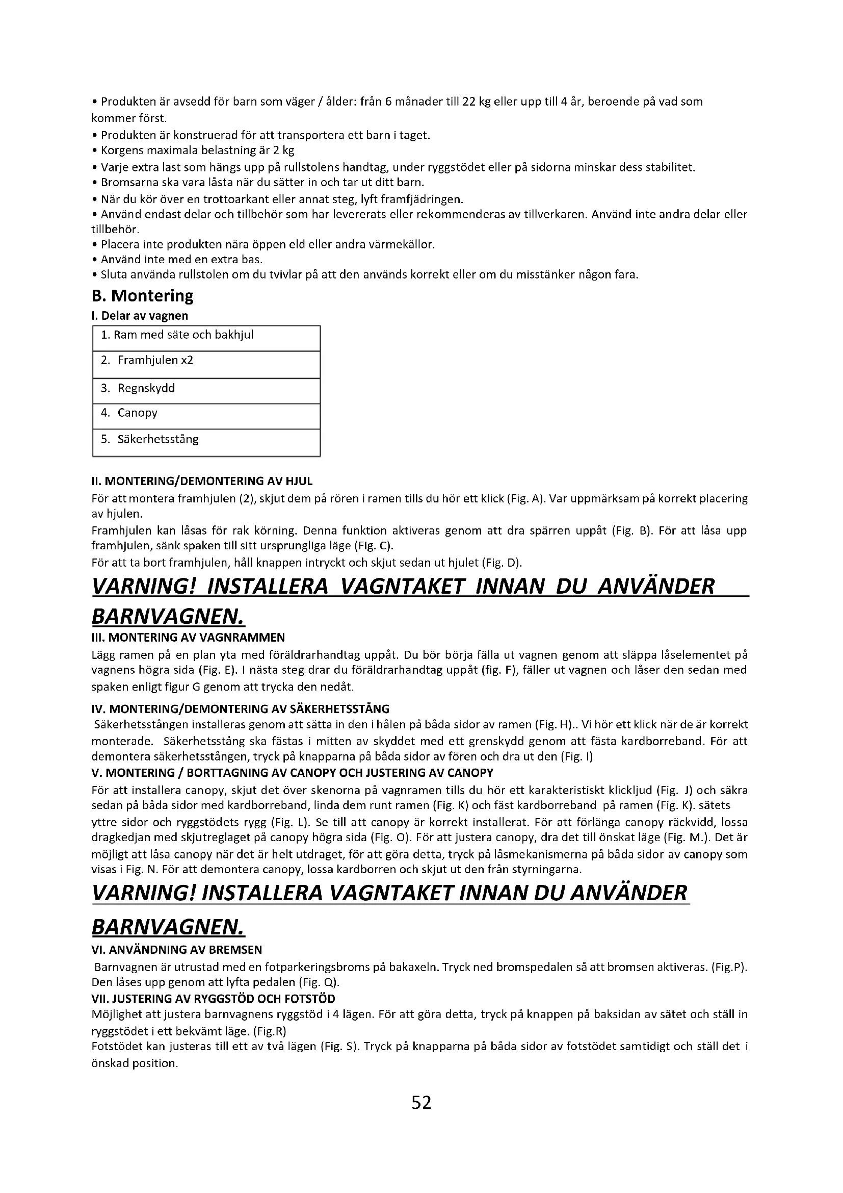 Barnvagnen är utrustad med en fotparkeringsbroms på bakaxeln. Tryck ned bromspedalen så att bromsen aktiveras. (Fig.P). Den låses upp genom att lyfta pedalen (Fig. Q).