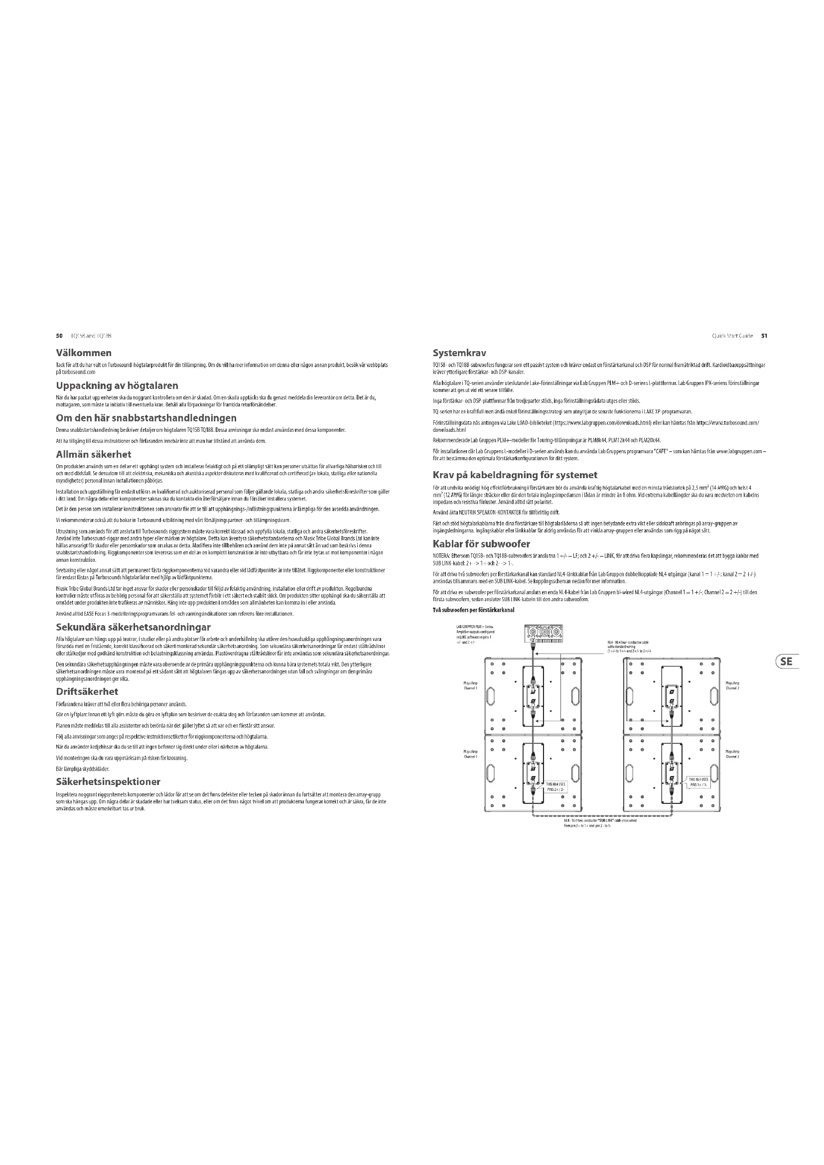 Front Input SUB + Not Connected Not Connected Front Input SUB - Rigging en akoestische simulatiesoftware De TQ15B TQ18B -luidspreker is geen arrayable product. Hij wordt ondersteund in Ease Focus 3, een akoestisch simulatieprogramma, verkrijgbaar als gratis download op https://www.afmg.eu/en/ease-focusv48 TQ15B and TQ18B Quick Start Guide 49 Installatie Veiligheidswaarschuwing: Alleen bevoegd en gecerticeerd personeel mag hangende conguraties ontwerpen en installeren. Onjuiste installatie kan leiden tot overlijden of permanente verwondingen. Het gebruik van een secundaire veiligheidskabel is een verplichte veiligheidsvereiste bij installatie van dit product met de M10-bevestigingspunten. De TQ15B TQ18B-luidspreker heeft voeten aan de onderkant om de luidspreker op een vlakke ondergrond te plaatsen, twee integrale stangmontagegaten, en M10-montagegaten met gemonteerde inbusbouten. Pole Mount Feet Grondstapeling De TQ15B/TQ18B kan horizontaal of verticaal op de grond worden gestapeld. Probeer er in verticale richting twee van te monteren met de poorten naast elkaar, zoals afgebeeld. Geschikte racketriemen die rond de kastgroep worden gelust, worden geadviseerd als extra veiligheidsmaatregel. Badgerotatie De Turbosound-badge is veerbelast en kan met de hand worden gedraaid voor verticale of horizontale positionering . Suspension De TQ15B TQ18B subwoofers zijn ontworpen met meerdere interne riggingpunten om te voldoen aan vele mogelijke montagemethoden in permanente installaties. Alle kasten kunnen eenvoudig worden opgehangen met behulp van optionele M10- schouderoogbouten die zijn gekoppeld aan de interne bevestigingspunten. Verwijder de juiste verzonken schroeven en vervang ze door oogbouten, die een draadlengte van ten minste 40 mm moeten hebben. Kasten kunnen indien nodig ondersteboven worden opgehangen. Rigging Points Eyebolts M10 Shoulder Eyebolt 40 mm Stangmontage Er zijn twee 35 mm gaten voor stangmontage Wij adviseren een 35 mm stang met een M20- schroefdraad aan de onderkant. Dit type zorgt voor meer stevigheid en kan in de bovenste houder van de subwoofer worden geschroefd. Transportwielen (optie) Met een optionele kit kunnen vier wielen worden gemonteerd zoals afgebeeld. Lake Preset-Overlays en toepassingsopmerkingen Alle luidsprekers uit de TQ-serie gebruiken uitsluitend Lake XP-presets via Lab Gruppen PLM+ en D-serie L-platformen en de komende IPX FiR-X-presets. Er worden geen andere versterkers en DSP-platforms ondersteund. De TQ-serie heeft een krachtige maar toch eenvoudige preset-strategie met behulp van de nieuwste functionaliteit van Lake-software, samen met nieuwe BLEQ- overlays. Preset-data vindt u via de Lake Load-bibliotheek of kunnen worden gedownload van www.turbosound.com Subwoofers TQ15B en TQ18B hebben elk individuele 1-weg passieve FIR-basispresets (1-kanaals DSP/amp). LET OP: Combineer subwoofers TQ15B en TQ18B niet op dezelfde versterker/DSP-schakeling. Het niet opvolgen van deze instructies kan leiden tot schade aan de apparatuur. LET OP: Controleer het patchen van de uitgang goed. TQ15B, TQ18B-modules zijn gebaseerd op de XP-module van Lake-software. Deze snelstartgids verwijst naar REV1.1 XP-presets. Lake-software V7.0.7 of hoger moet worden gebruikt. Signaalow Lake XP: De download van de Lake Controller bevat de Lake Controller bedieningshandleiding, wat een volledige tutorial is van de Lake Controller en compatibele hardware, zoals PLM+ serie versterkers In deze snelstartgids richten we ons op de workow van de Turbosound TQ-serie en presetstrategie, en gaan we uit van basiskennis van de Lake Controller.50 TQ15B and TQ18B Quick Start Guide 51 Välkommen Tack för att du har valt en Turbosound-högtalarprodukt för din tillämpning. Om du vill ha mer information om denna eller någon annan produkt, besök vår webbplats på turbosound.com Uppackning av högtalaren När du har packat upp enheten ska du noggrant kontrollera om den är skadad. Om en skada upptäcks ska du genast meddela din leverantör om detta. Det är du, mottagaren, som måste ta initiativ till eventuella krav. Behåll alla förpackningar för framtida returförsändelser. Om den här snabbstartshandledningen Denna snabbstartshandledning beskriver detaljer om högtalaren TQ15B TQ18B. Dessa anvisningar ska endast användas med dessa komponenter. Att ha tillgång till dessa instruktioner och förfaranden innebär inte att man har tillstånd att använda dem. Allmän säkerhet Om produkten används som en del av ett upphängt system och installeras felaktigt och på ett olämpligt sätt kan personer utsättas för allvarliga hälsorisker och till och med dödsfall. Se dessutom till att elektriska, mekaniska och akustiska aspekter diskuteras med kvalicerad och certierad (av lokala, statliga eller nationella myndigheter) personal innan installationen påbörjas. Installation och uppställning får endast utföras av kvalicerad och auktoriserad personal som följer gällande lokala, statliga och andra säkerhetsföreskrifter som gäller i ditt land. Om några delar eller komponenter saknas ska du kontakta din återförsäljare innan du försöker installera systemet. Det är den person som installerar konstruktionen som ansvarar för att se till att upphängnings-/infästningspunkterna är lämpliga för den avsedda användningen. Vi rekommenderar också att du bokar in Turbosound-utbildning med vårt försäljningspartner- och tillämpningsteam. Utrustning som används för att ansluta till Turbosounds riggsystem måste vara korrekt klassad och uppfylla lokala, statliga och andra säkerhetsföreskrifter. Använd inte Turbosound-riggar med andra typer eller märken av högtalare. Detta kan äventyra säkerhetsstandarderna och Music Tribe Global Brands Ltd kan inte hållas ansvarigt för skador eller personskador som orsakas av detta. Modiera inte tillbehören och använd dem inte på annat sätt än vad som beskrivs i denna snabbstartshandledning. Riggkomponenter som levereras som en del av en ko