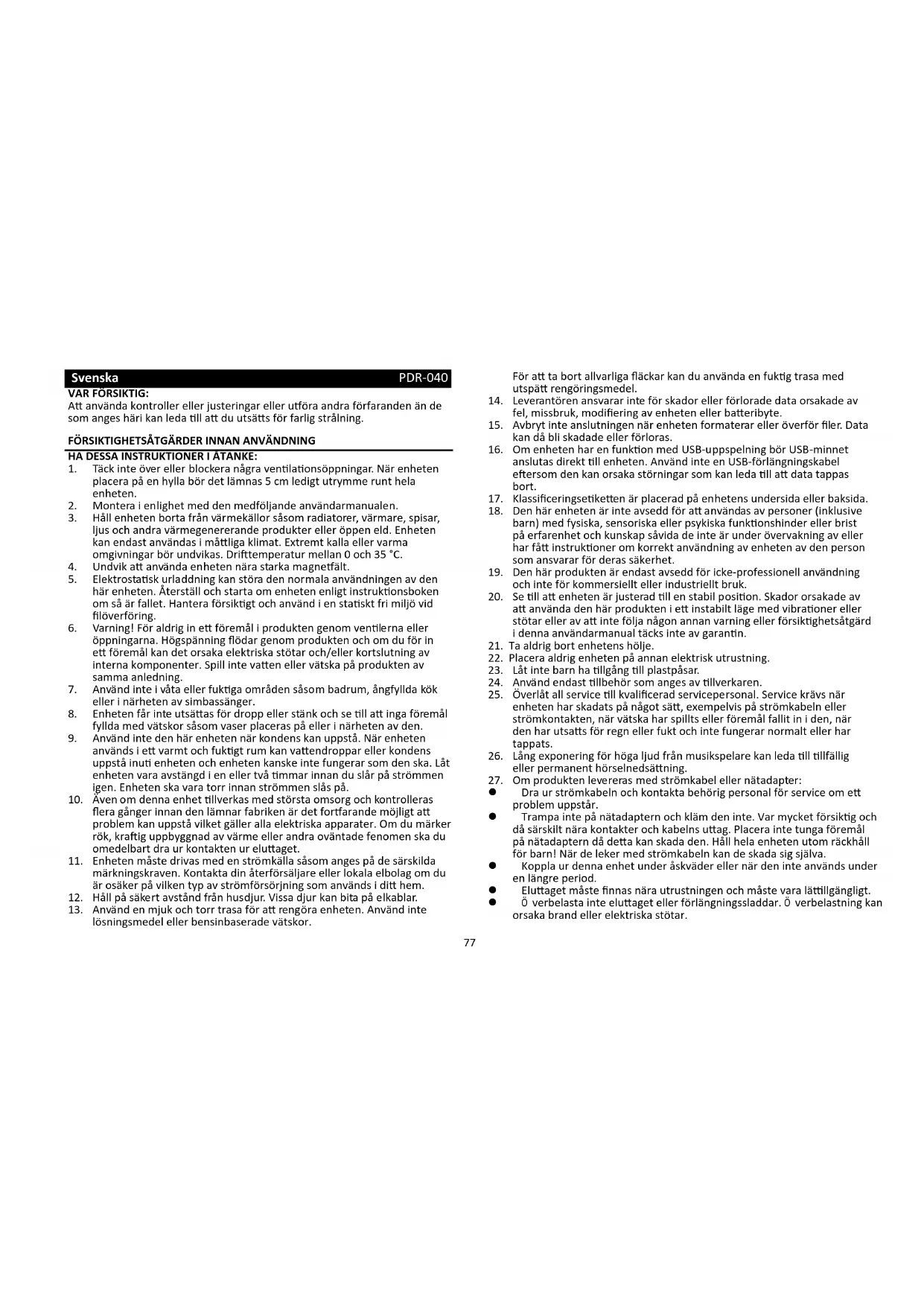 Service Gå ind på www.lenco.com for yderligere oplysninger og support fra vores helpdesk Commaxx B.V., Wiebachstraat 37, 6466 NG Kerkrade, Nederlandene.77 Svenska PDR-040 VAR FÖRSIKTIG: Att använda kontroller eller justeringar eller utföra andra förfaranden än de som anges häri kan leda till att du utsätts för farlig strålning. FÖRSIKTIGHETSÅTGÄRDER INNAN ANVÄNDNING HA DESSA INSTRUKTIONER I ÅTANKE: