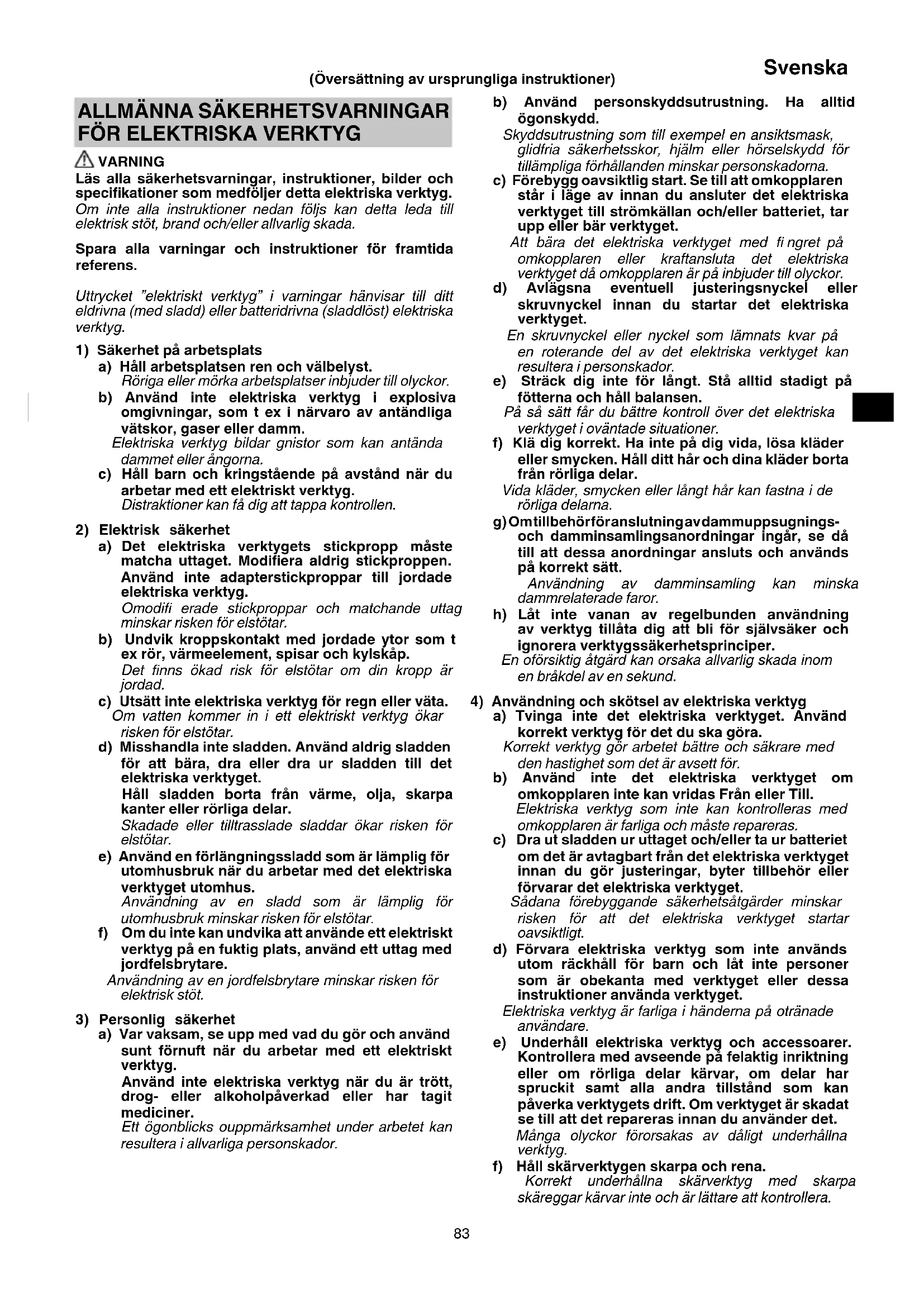 VARNING Läs alla säkerhetsvarningar, instruktioner, bilder och specifi kationer som medföljer detta elektriska verktyg. Om inte alla instruktioner nedan följs kan detta leda till elektrisk stöt, brand och/eller allvarlig skada. Spara alla varningar och instruktioner för framtida referens. Uttrycket ”elektriskt verktyg” i varningar hänvisar till ditt eldrivna (med sladd) eller batteridrivna (sladdlöst) elektriska verktyg.