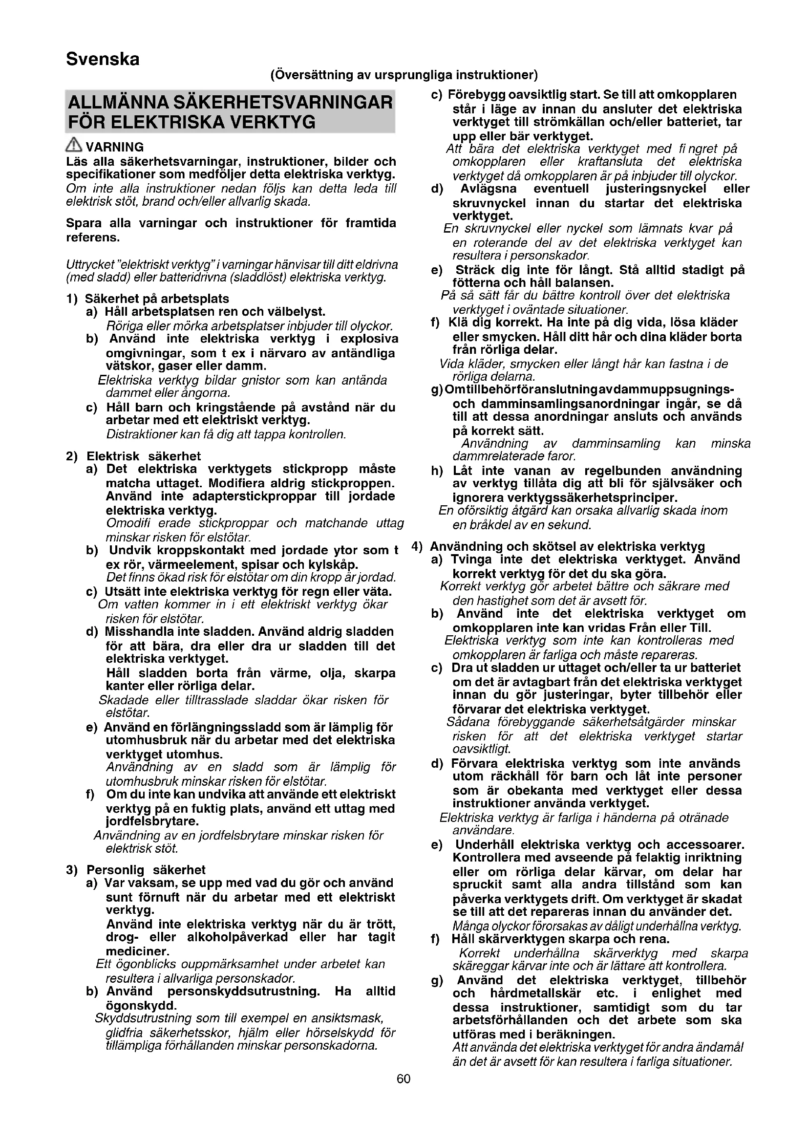 VARNING Läs alla säkerhetsvarningar, instruktioner, bilder och specifi kationer som medföljer detta elektriska verktyg. Om inte alla instruktioner nedan följs kan detta leda till elektrisk stöt, brand och/eller allvarlig skada. Spara alla varningar och instruktioner för framtida referens. Uttrycket ”elektriskt verktyg” i varningar hänvisar till ditt eldrivna (med sladd) eller batteridrivna (sladdlöst) elektriska verktyg.