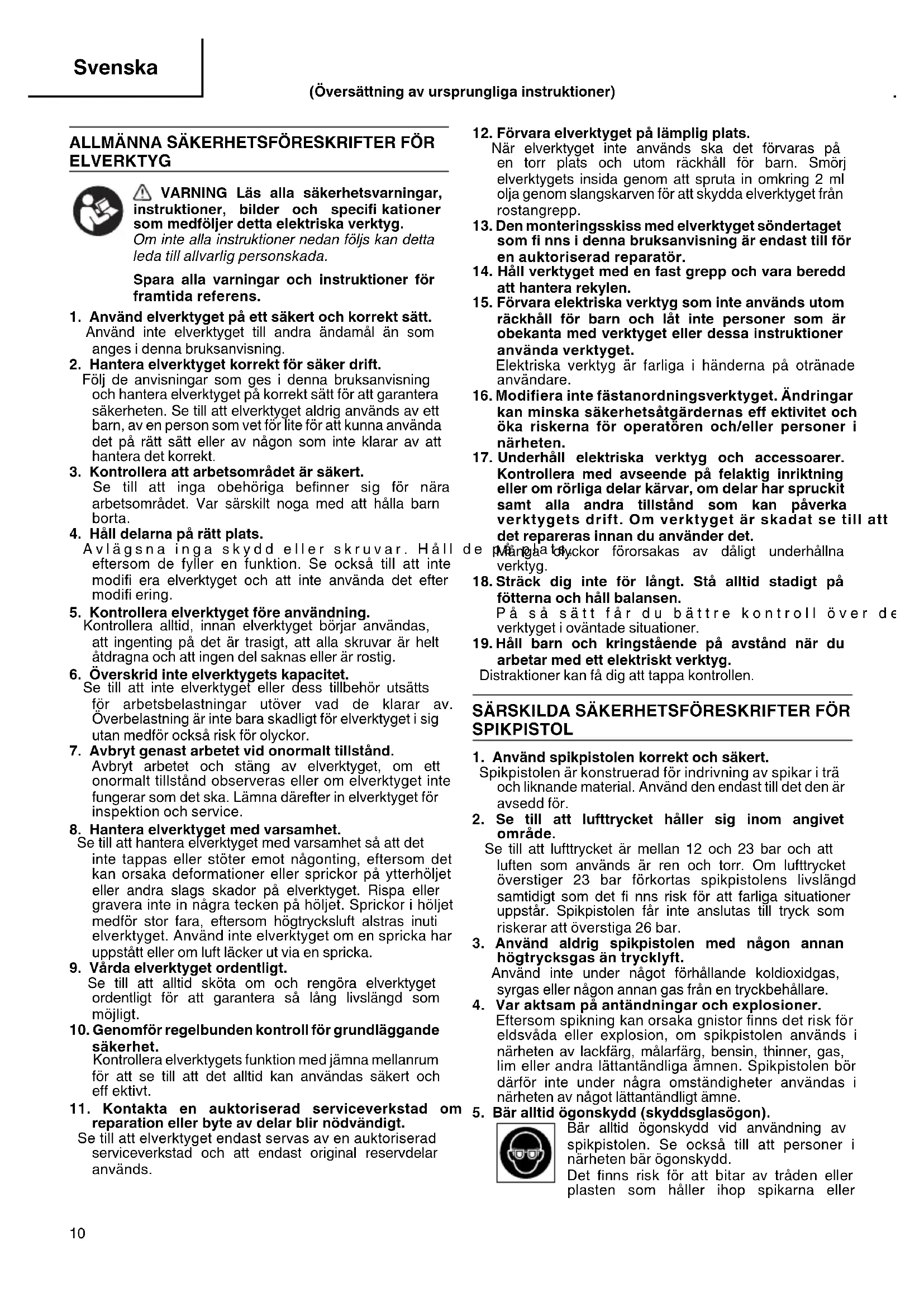 arbetar med ett elektriskt verktyg. Distraktioner kan få dig att tappa kontrollen. SÄRSKILDA SÄKERHETSFÖRESKRIFTER FÖR SPIKPISTOL