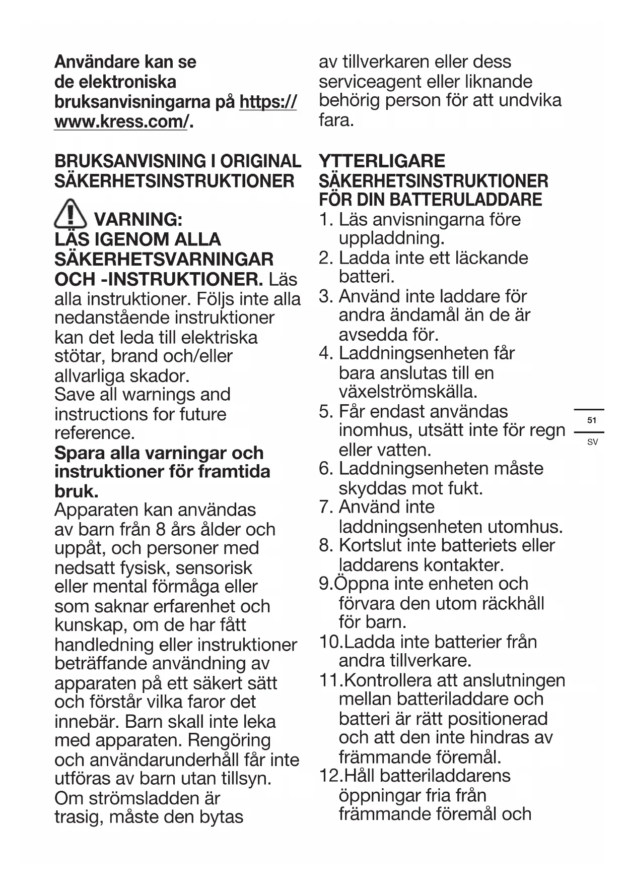 skydda dem mot smuts och fukt. Förvara enheten på en torr och frostfri plats. 13.Under laddning av batterier, kontrollera att batteriladdaren är placerad i ett väl ventilerat utrymme och långt bort från antändliga material. Batterier kan bli heta under laddning. Överladda inte batterier. Batterier och laddare får inte lämnas utan uppsikt under laddning. 14.Ladda inte engångsbatterier, eftersom de kan överhettas och gå sönder. 15.Om batteriet laddas i en temperatur mellan 18 och 24 grader får batteriet högre kapacitet och längre livslängd. Ladda inte batteriet i temperaturer under 0 eller över 40 grader. Detta är mycket viktigt eftersom det förhindrar allvarliga skador på batteriet. 16.Ladda endast batteripaket av samma modell som tillhandahålls av Kress och modeller som rekommenderas av Kres