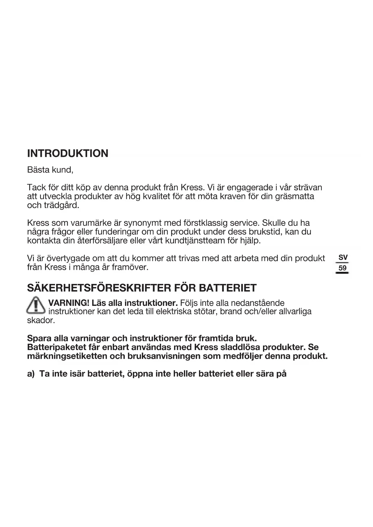 VARNING! Läs alla instruktioner. Följs inte alla nedanstående instruktioner kan det leda till elektriska stötar, brand och/eller allvarliga skador. Spara alla varningar och instruktioner för framtida bruk. Batteripaketet får enbart användas med Kress sladdlösa produkter. Se märkningsetiketten och bruksanvisningen som medföljer denna produkt. a) Ta inte isär batteriet, öppna inte heller batteriet eller sära på60