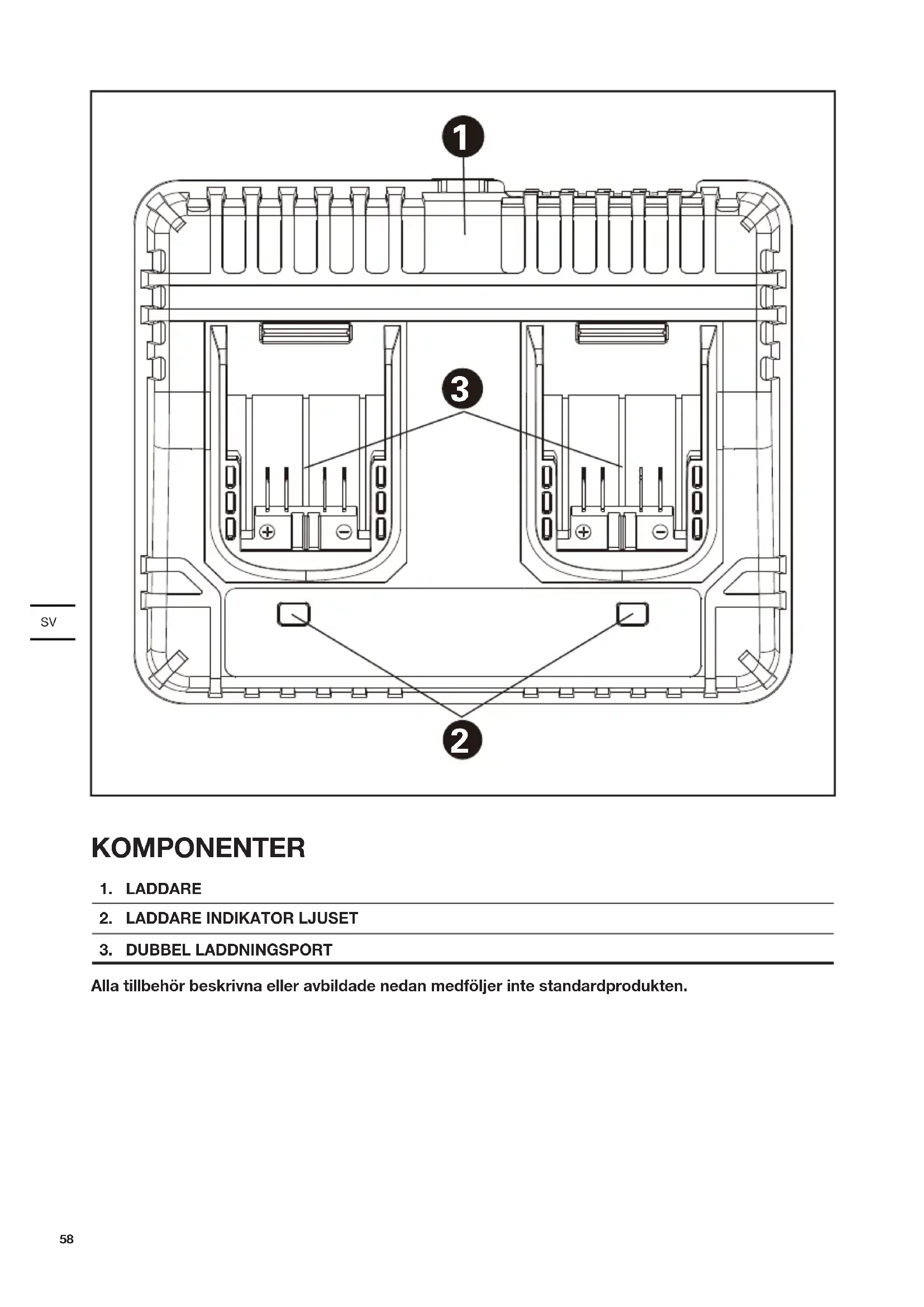 laddarens kontakter. 9.Öppna inte enheten och förvara den utom räckhåll för barn. 10.Ladda inte batterier från andra tillverkare. 11.Kontrollera att anslutningen mellan batteriladdare och batteri är rätt positionerad och att den inte hindras av främmande föremål. 12.Håll batteriladdarens öppningar fria från främmande föremål och skydda dem mot smuts60