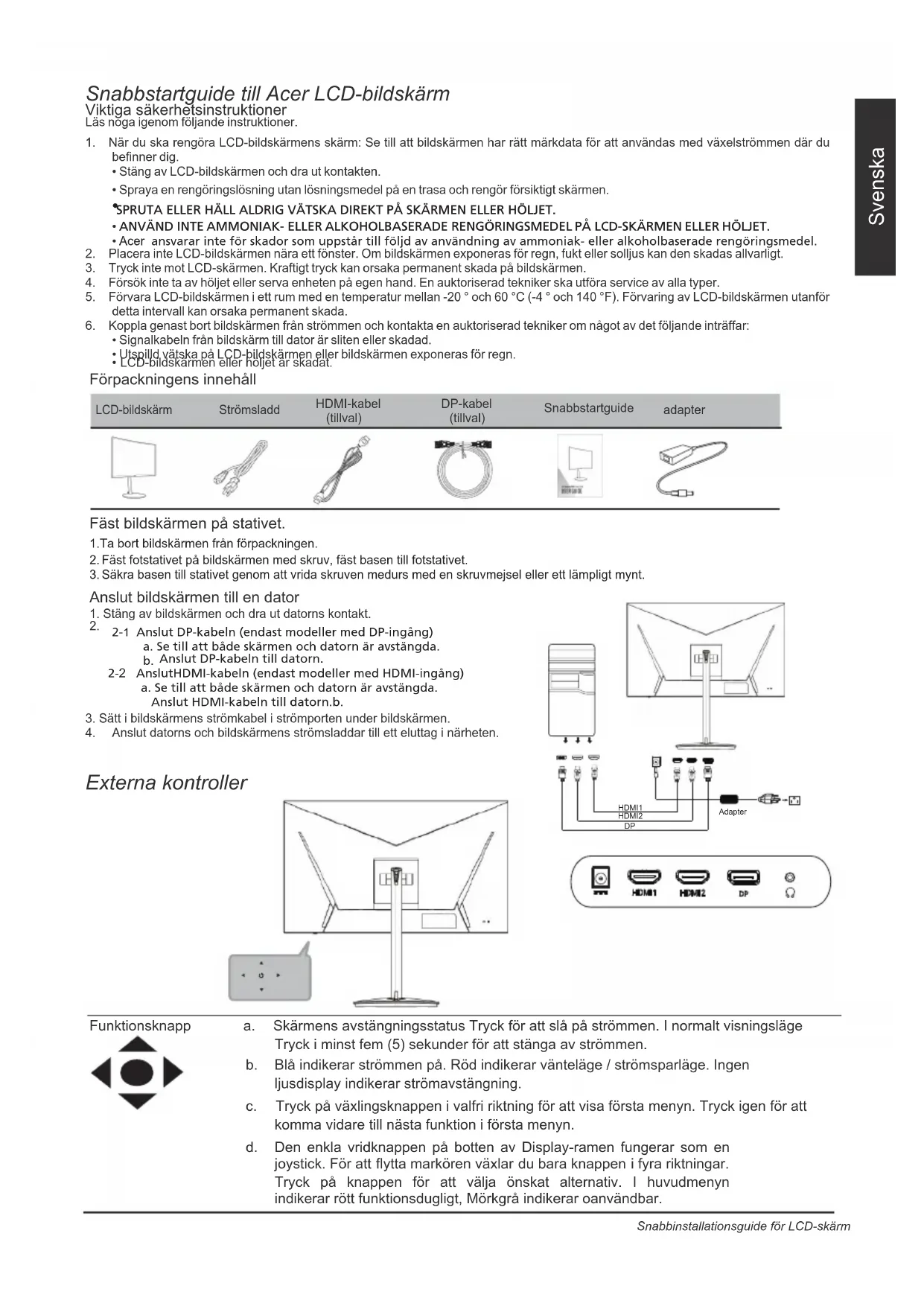 - Utspilld vätska på LCD-bildskärmen eller bildskärmen exponeras för regn. LCD-bildskärmen eller höljet är skadat.LCD-bildskärm StrömsladdDP-kabel (tillval)HDMI-kabel (tillval)Snabbstartguide Fäst bildskärmen på stativet. Anslut bildskärmen till en dator