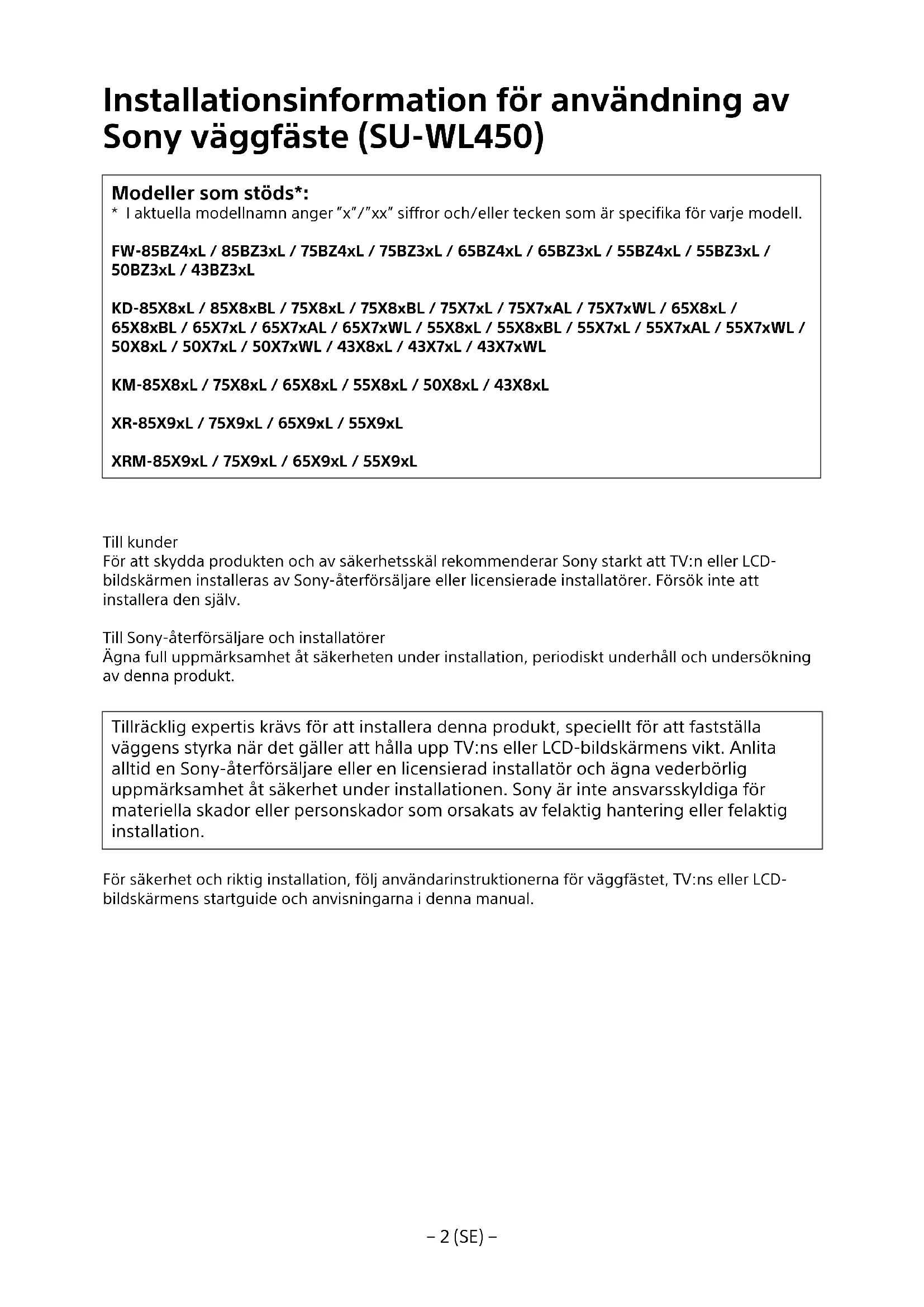- I aktuella modellnamn anger ”x”/”xx” siffror och/eller tecken som är specifika för varje modell. FW-85BZ4xL / 85BZ3xL / 75BZ4xL / 75BZ3xL / 65BZ4xL / 65BZ3xL / 55BZ4xL / 55BZ3xL / 50BZ3xL / 43BZ3xL KD-85X8xL / 85X8xBL / 75X8xL / 75X8xBL / 75X7xL / 75X7xAL / 75X7xWL / 65X8xL / 65X8xBL/ 65X7xL / 65X7xAL / 65X7xWL / 55X8xL / 55X8xBL / 55X7xL / 55X7xAL / 55X7xWL / 50X8xL / 50X7xL / 50X7xWL / 43X8xL / 43X7xL / 43X7xWL KM-85X8xL / 75X8xL / 65X8xL / 55X8xL / 50X8xL / 43X8xL XR-85X9xL / 75X9xL / 65X9xL / 55X9xL XRM-85X9xL / 75X9xL / 65X9xL / 55X9xL Till kunder För att skydda produkten och av säkerhetsskäl rekommenderar Sony starkt att TV:n eller LCD- bildskärmen installeras av Sony-återförsäljare eller licensierade installatörer. Försök inte att installera den själv. Till Sony-återförsäljare och installatörer Ägna full uppmärksamhet åt säkerheten under installation, periodiskt underhåll och undersökning av denna produkt. Tillräcklig expertis krävs för att installera denna produkt, speciellt för att fastställa väggens styrka när det gäller att hålla upp TV:ns eller LCD-bildskärmens vikt. Anlita alltid en Sony-återförsäljare eller en licensierad installatör och ägna vederbörlig uppmärksamhet åt säkerhet under installationen. Sony är inte ansvarsskyldiga för materiella skador eller personskador som orsakats av felaktig hantering eller felaktig installation. För säkerhet och riktig installation, följ användarinstruktionerna för väggfästet, TV:ns eller LCD- bildskärmens startguide och anvisningarna i denna manual.− 3 (SE) −