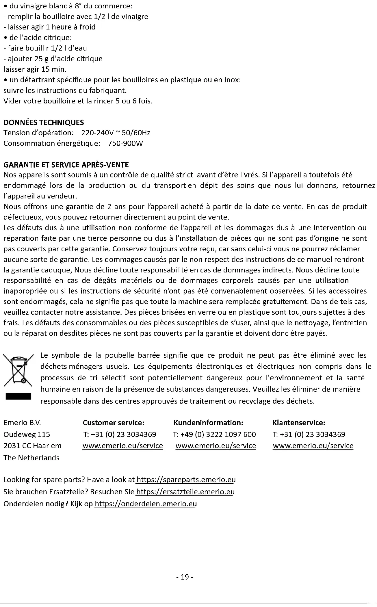 Innan leverans genomgår våra apparater en sträng kvalitetskontroll. Om det trots detta skulle uppstå någon skada på produktionen eller vid transporten, ber vi dig att ta med apparaten tillbaka till inköpsstället. För den köpta apparaten ges 2 års garanti, med början på inköpsdagen. Om du har en defekt produkt, kan du vända dig direkt till inköpsstället. Brister som uppstår genom felaktig hantering av apparaten och fel som uppstår genom ingrepp och reparationer av tredje man eller montering av främmande delar, omfattas ej av vår garanti. Behåll alltid ditt kvitto då det är din garanti vid eventuell reklamation. Skador som uppstår p.g.a. att instruktionsmanualen inte följs ogiltigförklarar garantin och om detta leder till påföljande skador så kan inte vi hållas ansvariga. Vi kan inte hållas ansvariga för materiella skador eller personskador som orsakas av felaktig användning eller om inte säkerhetsföreskrifterna följs. Skador på tillbehören innebär inte per automatik ersättning av hela apparaten. I sådana fall ska du kontakta vår kundservice. Trasigt glas och trasiga plastdelar innebär alltid en kostnad. Defekter på förbrukningsartiklar eller slitdelar och även skador orsakade av rengöring, underhåll eller byte av tidigare nämnda delar täcks inte av garantin och ska således betalas av ägaren. Den överkorsade soptunnan betyder att denna produkt inte skall kastas i de vanliga hushållssoporna. Elektronisk och elektrisk utrustning som inte källsorteras utgör en potentiell risk för miljön och människors hälsa på grund av att de innehåller farliga substanser. Avyttra på ett ansvarsfullt sätt och lämna till en godkänd återvinningsanläggning. Emerio B.V. Customer service: Kundeninformation: Klantenservice: Oudeweg 115 T: +31 (0) 23 3034369 T: +49 (0) 3222 1097 600 T: +31 (0) 23 3034369 2031 CC Haarlem www.emerio.eu/service www.emerio.eu/service www.emerio.eu/service The Netherlands Looking for spare parts? Have a look at https://spareparts.emerio.eu Sie brauchen Ersatzteile? Besuchen Sie https://ersatzteile.emerio.eu Onderdelen nodig? Kijk op https://onderdelen.emerio.eu- 25 - Gebruiksaanwijzing – Dutch VEILIGHEIDSVOORSCHRIFTEN Voor gebruik dient u alle onderstaande instructies te lezen om letsel en schade te voorkomen en om de beste resultaten met het apparaat te bereiken. Bewaar deze handleiding op een veilige plek. Mocht u dit apparaat aan iemand anders overhandigen, dient u ook de gebruiksaanwijzing te overhandigen. In geval van schade die wordt veroorzaakt doordat de gebruiker de instructies in deze gebruiksaanwijzing niet in acht heeft genomen, komt de garantie te vervallen. De fabrikant/importeur is niet aansprakelijk voor schade die wordt veroorzaakt door het niet in acht nemen van de gebruiksaanwijzing, door nalatig gebruik of gebruik dat niet in overeenstemming is met de bepalingen van deze gebruiksaanwijzing.
