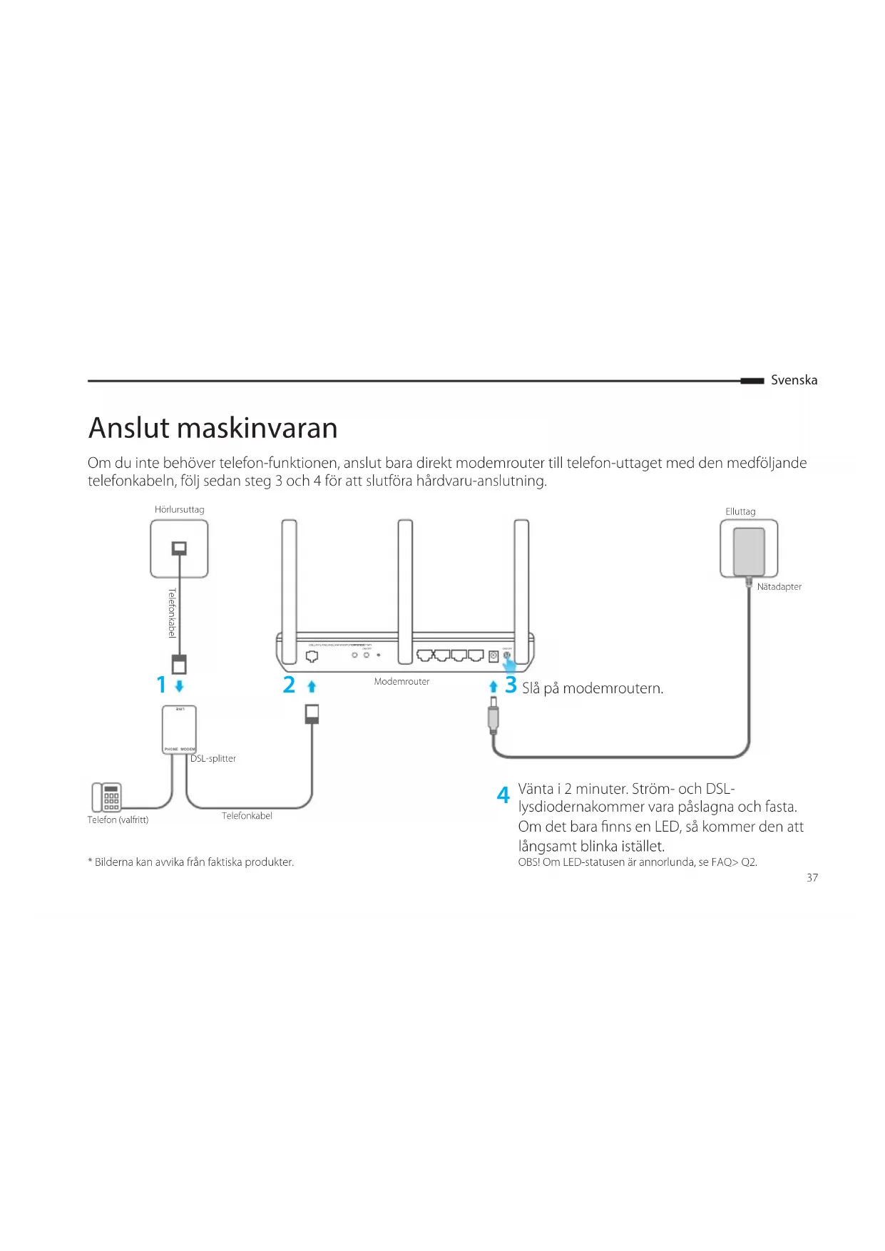 DSL LAN1 LAN2 LAN3 LAN4/WAN POWER POWERON/OFFWPS RESETWiFiON/OFF* Bilderna kan avvika från faktiska produkter.HörlursuttagTelefonkabelTelefonkabelModemrouter Slå på modemroutern. ElluttagNätadapterDSL-splitter Telefon (valfritt)OBS! Om LED-statusen är annorlunda, se FAQ> Q2. Vänta i 2 minuter. Ström- och DSL- lysdiodernakommer vara påslagna och fasta. Om det bara nns en LED, så kommer den att långsamt blinka istället.Svenska