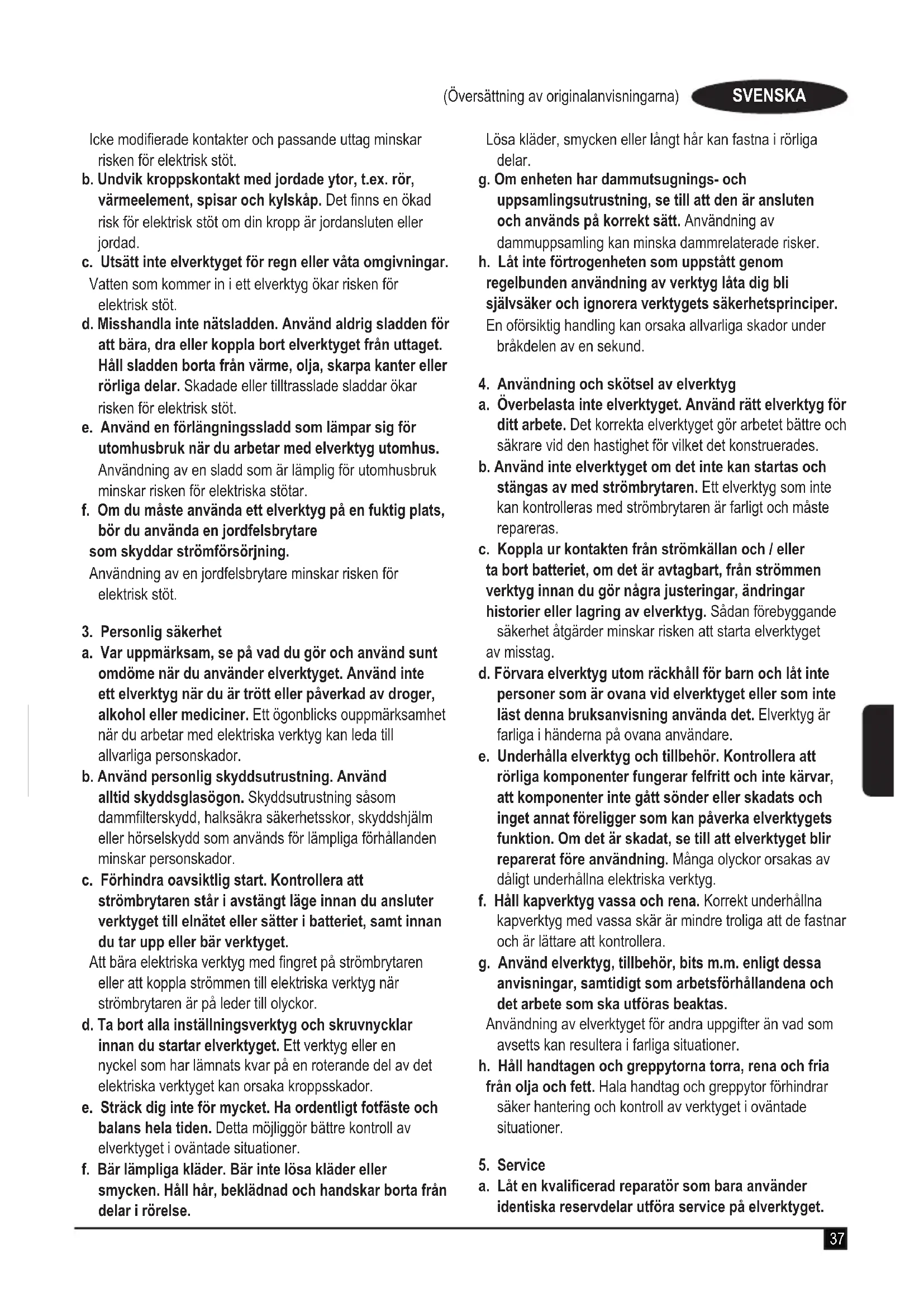 a. Låt en kvalicerad reparatör som bara använder identiska reservdelar utföra service på elverktyget.38 (Översättning av originalanvisningarna) SVENSKA Detta säkerställer att elverktygets säkerhet bibehålles. Ytterligare säkerhetsanvisningar för elverktyg