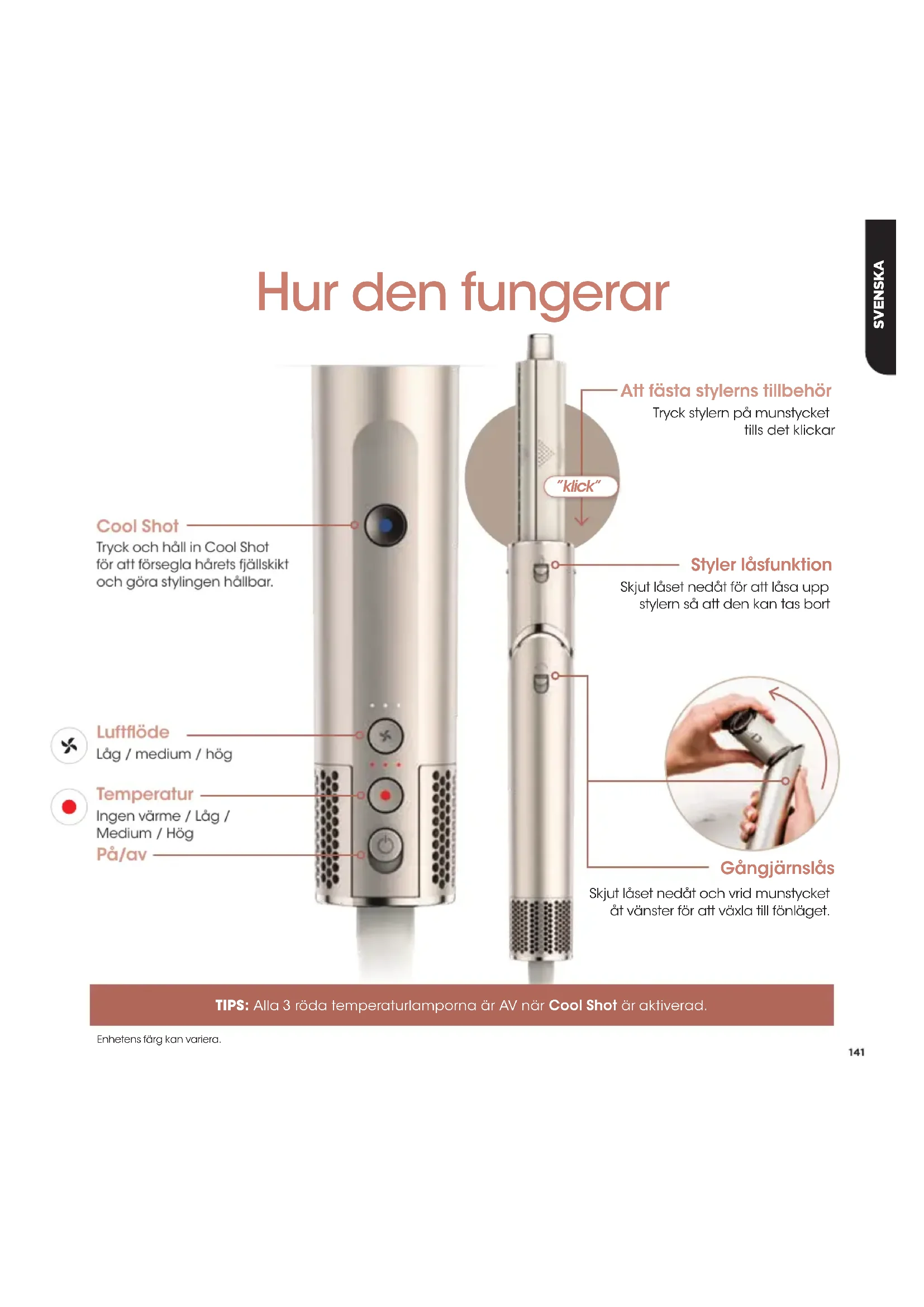 - -151 Munstycke för lockar* -153 *Punktstyler och munstycke för lockar ingår inte i HD420EU/HD420SLEU För tillbehör och utbyte av komponenter, besök sharkclean.eu141 Luftflöde Låg / medium / hög Cool Shot Tryck och håll in Cool Shot för att försegla hårets fjällskikt och göra stylingen hållbar. Temperatur Ingen värme / Låg / Medium / Hög På/av Styler låsfunktion Skjut låset nedåt för att låsa upp stylern så att den kan tas bort Att fästa stylerns tillbehör Tryck stylern på munstycket tills det klickar ”klick” Gångjärnslås Skjut låset nedåt och vrid munstycket åt vänster för att växla till fönläget. TIPS: Alla 3 röda temperaturlamporna är AV när Cool Shot är aktiverad. Enhetens färg kan variera. Hur den fungerar SVENSKA142 Gå från styler till fön. Roterar för att ändra läge p. 152