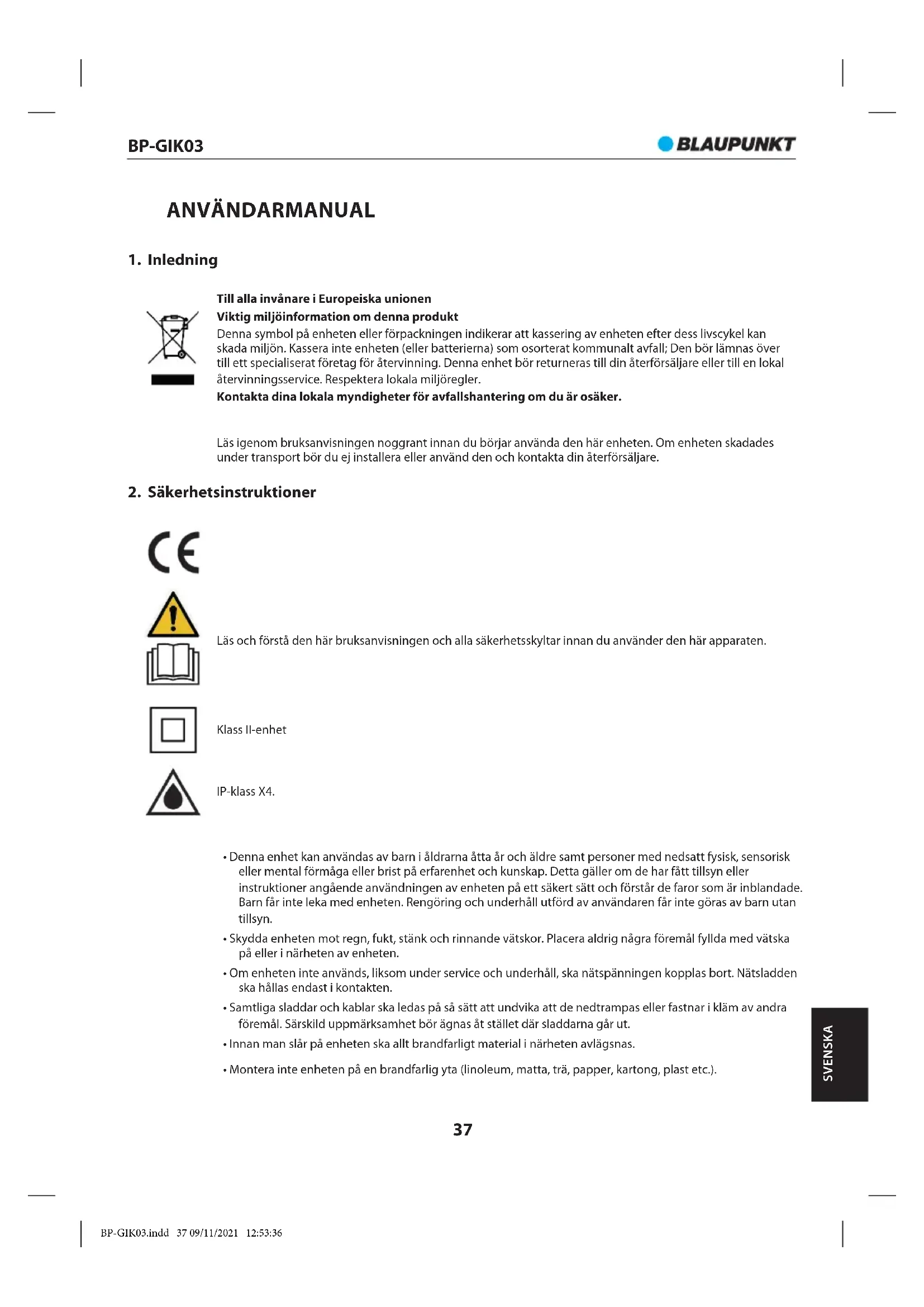 - Behåll den här bruksanvisningen för framtida referens. BP-GIK03.indd 38 09/11/2021 12:53:36BP-GIK03