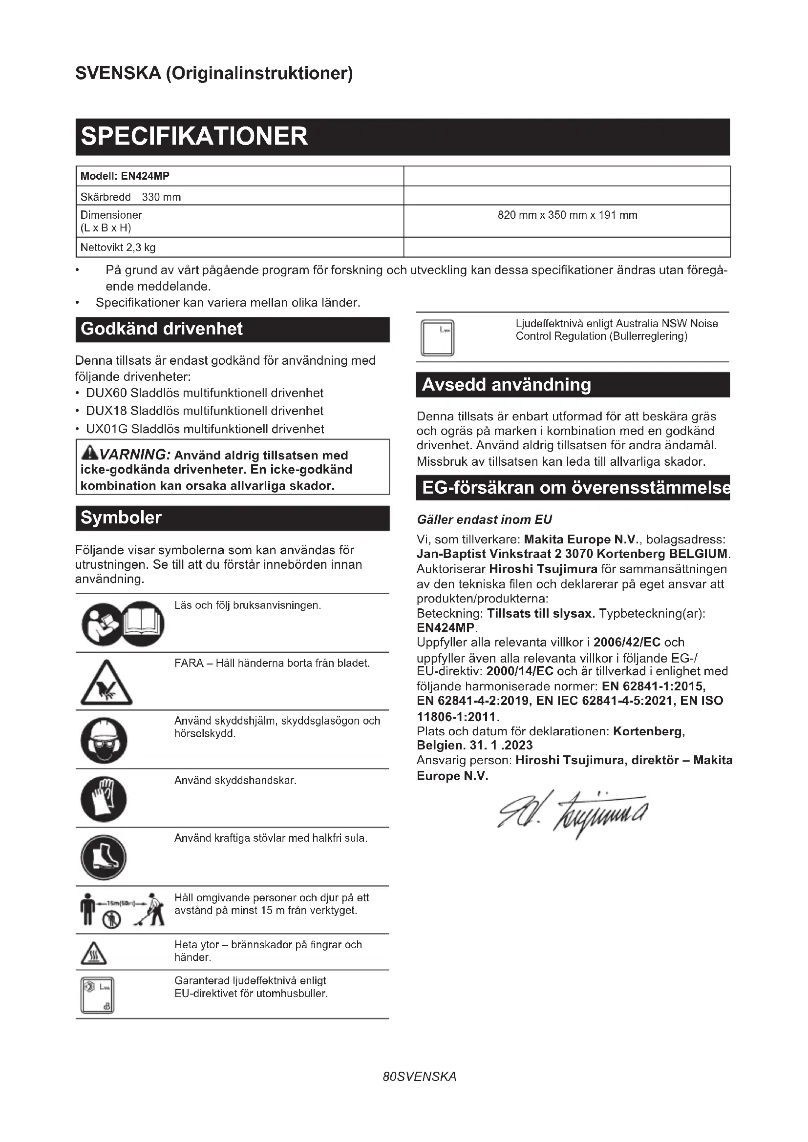 - UX01G Sladdlös multifunktionell drivenhet VARNING: Använd aldrig tillsatsen med icke-godkända drivenheter. En icke-godkänd kombination kan orsaka allvarliga skador. Symboler Följandevisarsymbolernasomkananvändasför utrustningen.Setillattduförstårinnebördeninnan användning. Läsochföljbruksanvisningen. FARA–Hållhändernabortafrånbladet. Användskyddshjälm,skyddsglasögonoch hörselskydd. Användskyddshandskar. Använd kraftiga stövlar med halkfri sula. Hållomgivandepersonerochdjurpåett avståndpåminst15mfrånverktyget. Hetaytor–brännskadorpångraroch händer. Garanteradljudeektnivåenligt EU-direktivetförutomhusbuller. LjudeektnivåenligtAustraliaNSWNoise Control Regulation (Bullerreglering) Avsedd användning Dennatillsatsärenbartutformadförattbeskäragräs ochogräspåmarkenikombinationmedengodkänd drivenhet. Använd aldrig tillsatsen för andra ändamål. Missbrukavtillsatsenkanledatillallvarligaskador. EG-försäkran om överensstämmelse Gäller endast inom EU Vi, som tillverkare: Makita Europe N.V.,bolagsadress: Jan-Baptist Vinkstraat 2 3070 Kortenberg BELGIUM. Auktoriserar Hiroshi Tsujimura för sammansättningen avdentekniskalenochdeklarerarpåegetansvaratt produkten/produkterna: Beteckning: Tillsats till slysax.Typbeteckning(ar): EN424MP. Uppfyllerallarelevantavillkori2006/42/EC och uppfyllerävenallarelevantavillkoriföljandeEG-/ EU-direktiv: 2000/14/EC och är tillverkad i enlighet med följandeharmoniseradenormer:EN 62841-1:2015, EN 62841-4-2:2019, EN IEC 62841-4-5:2021, EN ISO 11806-1:2011. Plats och datum för deklarationen: Kortenberg, Belgien. 31. 1 .2023 Ansvarig person: Hiroshi Tsujimura, direktör – Makita Europe N.V.81 SVENSKA SÄKERHETSVARNINGAR Säkerhetsvarningar för batteridriven kantsax