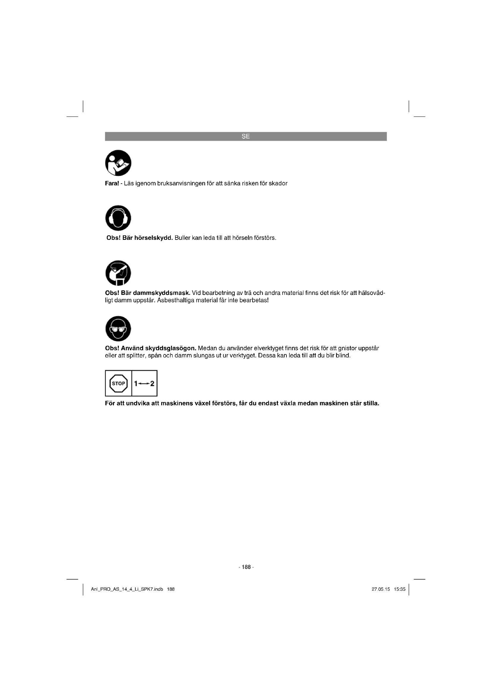 Fara! - Läs igenom bruksanvisningen för att sänka risken för skador Obs! Bär hörselskydd. Buller kan leda till att hörseln förstörs. Obs! Använd skyddsglasögon. Medan du använder elverktyget fi nns det risk för att gnistor uppstår eller att splitter, spån och damm slungas ut ur verktyget. Dessa kan leda till att du blir blind. Obs! Bär dammskyddsmask. Vid bearbetning av trä och andra material fi nns det risk för att hälsovåd- ligt damm uppstår. Asbesthaltiga material får inte bearbetas! För att undvika att maskinens växel förstörs, får du endast växla medan maskinen står stilla. Anl_PRO_AS_14_4_Li_SPK7.indb 188Anl_PRO_AS_14_4_Li_SPK7.indb 188 27.05.15 15:3527.05.15 15:35SE