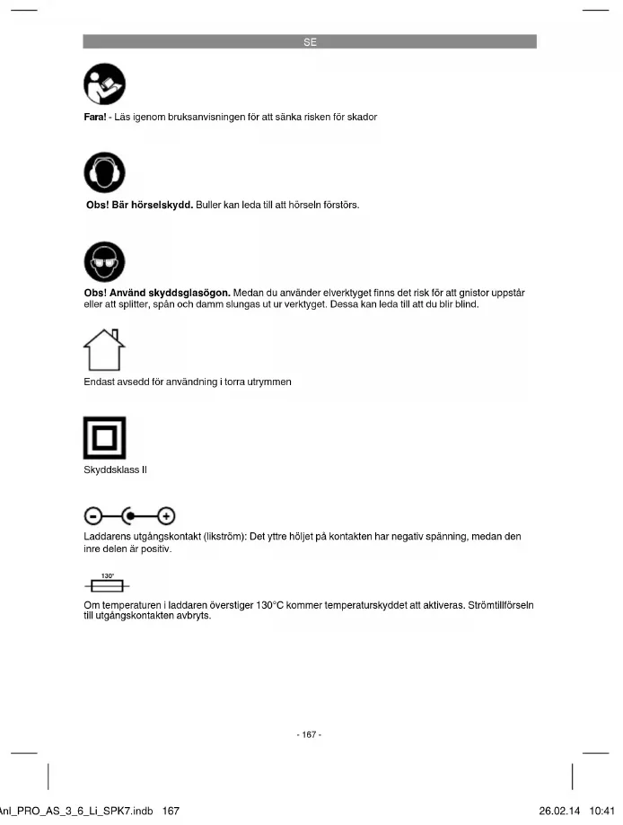 Fara! - Läs igenom bruksanvisningen för att sänka risken för skador Obs! Bär hörselskydd. Buller kan leda till att hörseln förstörs. Obs! Använd skyddsglasögon. Medan du använder elverktyget fi nns det risk för att gnistor uppstår eller att splitter, spån och damm slungas ut ur verktyget. Dessa kan leda till att du blir blind. Endast avsedd för användning i torra utrymmen Skyddsklass II Laddarens utgångskontakt (likström): Det yttre höljet på kontakten har negativ spänning, medan den inre delen är positiv. 130° Om temperaturen i laddaren överstiger 130°C kommer temperaturskyddet att aktiveras. Strömtillförseln till utgångskontakten avbryts. Anl_PRO_AS_3_6_Li_SPK7.indb 167Anl_PRO_AS_3_6_Li_SPK7.indb 167 26.02.14 10:4126.02.14 10:41SE
