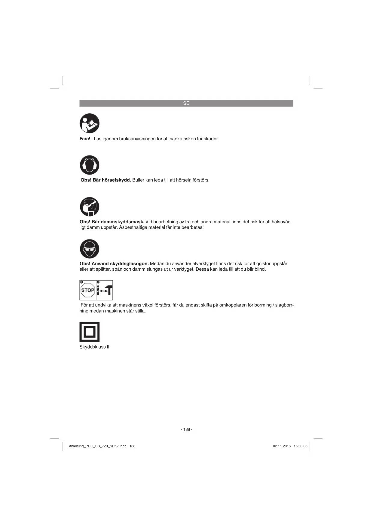 Fara! - Läs igenom bruksanvisningen för att sänka risken för skador Obs! Bär hörselskydd. Buller kan leda till att hörseln förstörs. Obs! Använd skyddsglasögon. Medan du använder elverktyget fi nns det risk för att gnistor uppstår eller att splitter, spån och damm slungas ut ur verktyget. Dessa kan leda till att du blir blind. Obs! Bär dammskyddsmask. Vid bearbetning av trä och andra material fi nns det risk för att hälsovåd- ligt damm uppstår. Asbesthaltiga material får inte bearbetas! För att undvika att maskinens växel förstörs, får du endast skifta på omkopplaren för borrning / slagborr- ning medan maskinen står stilla. Skyddsklass II Anleitung_PRO_SB_720_SPK7.indb 188Anleitung_PRO_SB_720_SPK7.indb 188 02.11.2016 15:03:0602.11.2016 15:03:06SE