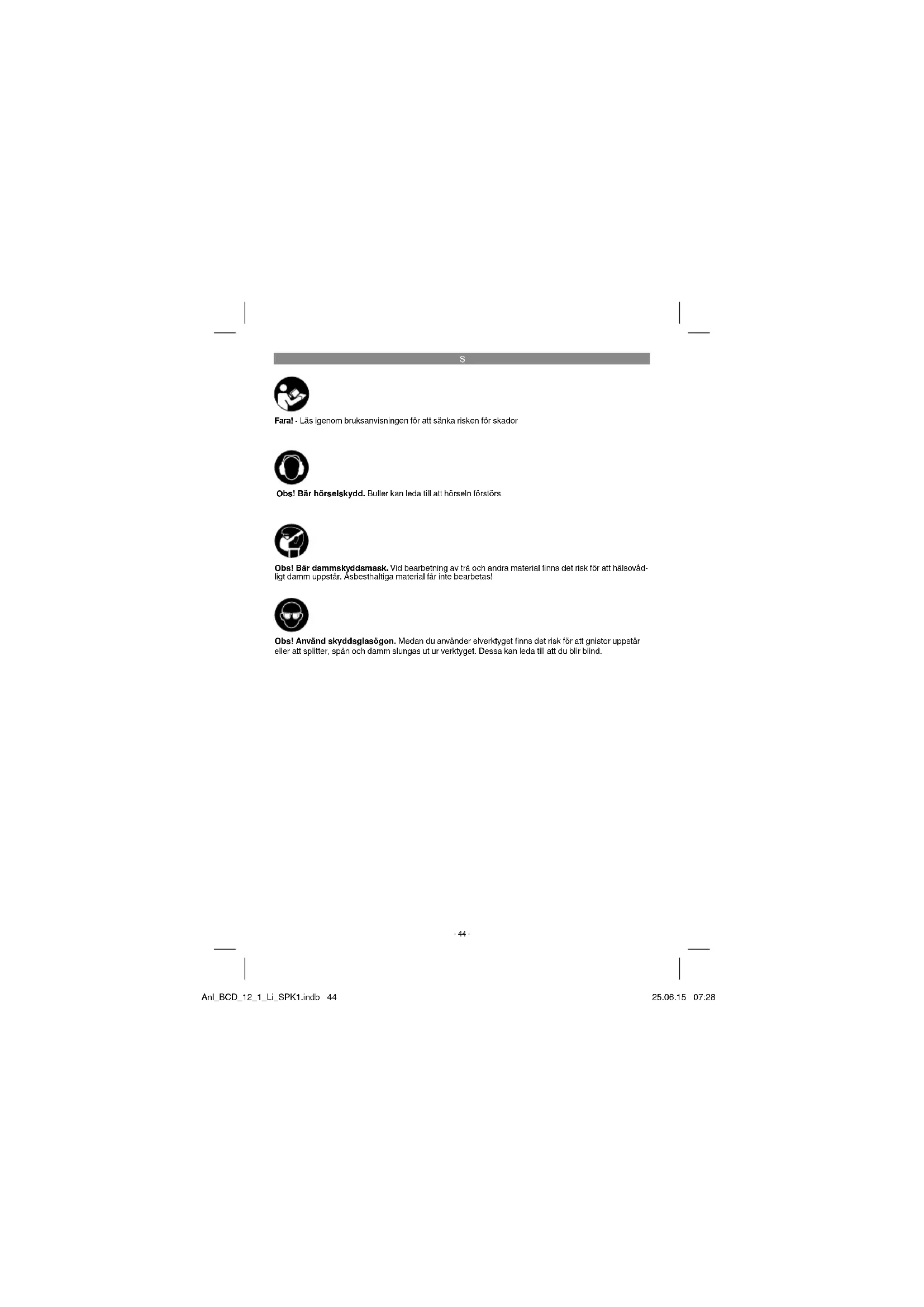 Fara! - Läs igenom bruksanvisningen för att sänka risken för skador Obs! Bär hörselskydd. Buller kan leda till att hörseln förstörs. Obs! Använd skyddsglasögon. Medan du använder elverktyget fi nns det risk för att gnistor uppstår eller att splitter, spån och damm slungas ut ur verktyget. Dessa kan leda till att du blir blind. Obs! Bär dammskyddsmask. Vid bearbetning av trä och andra material fi nns det risk för att hälsovåd- ligt damm uppstår. Asbesthaltiga material får inte bearbetas! Anl_BCD_12_1_Li_SPK1.indb 44Anl_BCD_12_1_Li_SPK1.indb 44 25.06.15 07:2825.06.15 07:28S