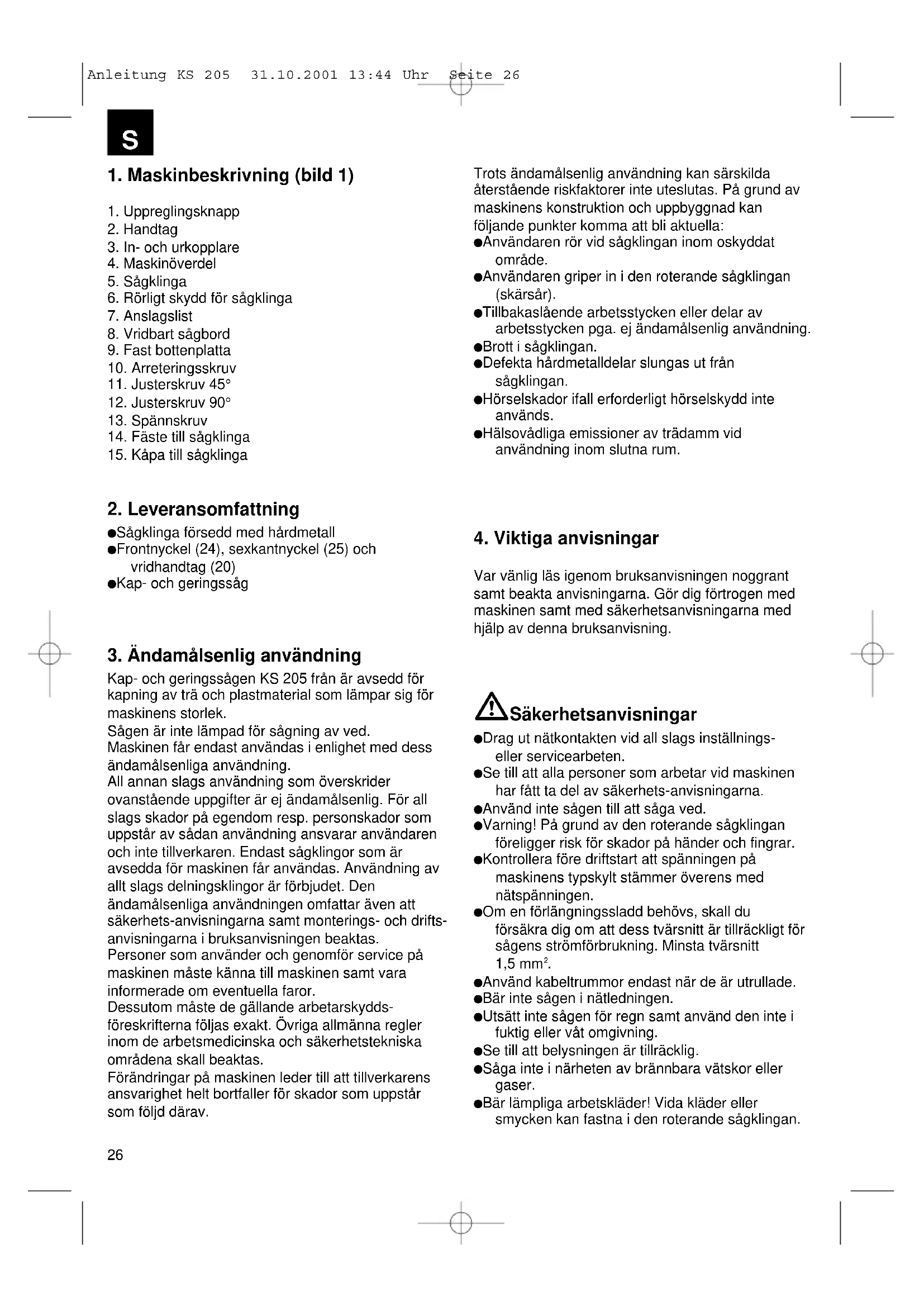 Anleitung KS 205 31.10.2001 13:44 Uhr Seite 2627 Användaren måste vara minst 18 år, lärlingar minst 16 år, dock vara under uppsikt. Se till att barn inte befinner sig vid maskinen om den är ansluten till nätet. Kontrollera nätanslutningsledningen. Använd inga defekta eller skadade anslutnings-ledningar. Se till att arbetsplatsen är fri från träavfall och omkringliggande delar. Personer som arbetar vid maskinen får inte distraheras. Beakta motorns och sågklingans rotations- riktning. Efter att driften har kopplats ur, får sågklingan under inga omständigheter bromsas genom att man pressar in dess sidor. Montera endast in vassa, sprickfria och ej deformerade sågklingor. Endast verktyg som motsvarar prEN 847:1:1996 får användas vid maskinen. Defekta sågklingor måste omedelbart bytas ut. Använd inga sågklingor som inte motsvarar specifikationerna som anges i denna bruksanvisning. Försäkra dig om att pilen på sågklingan stämmer överens med pilen på maskinen. Försäkra dig om att sågklingan oavsett läge inte berör det vridbara sågbordet genom att vrida sågklingan per hand i lägena 45° och 90°, förutsatt att nätkontakten har dragits ur. Vid behov måste sågens överdel justeras om enl. punkt C/F. Försäkra dig om att alla anordningar som täcker sågklingan fungerar i fullgott tillstånd. Den rörliga skyddskåpan får inte klämmas fast vid öppnat tillstånd. Säkerhetsanordningar vid maskinen får inte demonteras eller göras funktionsodugliga. Skadade eller defekta skyddsanordningar skall omedelbart bytas ut. Såga inga arbetsstycken som har så liten storlek att de inte kan hållas med handen på ett säkert sätt. Undvik att ha handen eller händerna placerade på ett sådant olämplig sätt att de kan skadas av sågklingan om de plötsligt skulle glida. Vid längre arbetsstycken är ett extra support (bord, bockar etc.) erforderligt för att undvika att maskinen tippar. Runda arbetsstycken som t.ex. pluggstänger etc., måste alltid vara fastspända med någon lämplig anordning. Spik eller andra främmande föremål får inte befinna sig i den del av arbetsstycket som ska sågas. Arbeta alltid vid sidan om sågklingan. Belasta inte maskinen på ett sådant sätt att den stannar. Tryck alltid arbetsstycket mot arbetsplattan och anslagslisten för att förhindra att arbetsstycket vacklar eller vrids. Försäkra dig om att de avsågade delarna kan falla bort från sågklingan. I annat fall kan de fastna i sågklingan och slungas iväg. Såga aldrig flera arbetsstycken samtidigt. Tag aldrig bort löst splitter, spån eller fastklämda träbitar medan sågklingan roterar. Innan störningar elimineras eller fastklämda träbitar tas bort, skall maskinen kopplas ur. -Drag ut nätkontakten - Ombestyckning samt inställnings-, mät- samt rengöringsarbeten får endast genomföras vid urkopplad motor. - Drag ut nätkontakten - Kontrollera före inkoppling att nycklar och inställningsverktyg har tagits bort. Koppla ur motorn samt drag ut nätkontakten när du lämnar arbetsplatsen. Elinstallations- och servicearbeten samt reparationer får endast genomföras av fackmän. Efter avslutad reparation resp. service måste samtliga skydds- och säkerhetsanordningar monteras fast på nytt. Tillverkarens säkerhets-, arbets- samt serviceanvisningar samt måtten som anges i förteckningen över tekniska data skall beaktas. De hithörande arbetarskyddsföreskrifterna samt övriga, allmänt erkända säkerhets-tekniska regler måste beaktas. Beakta anvisningshäftena från yrkesförbundet (VBG 7j) Anslut dammutsugningsanordningen vid alla slags arbeten. Drift i slutna rum är endast tillåtet vid lämplig utsugningsanläggning.