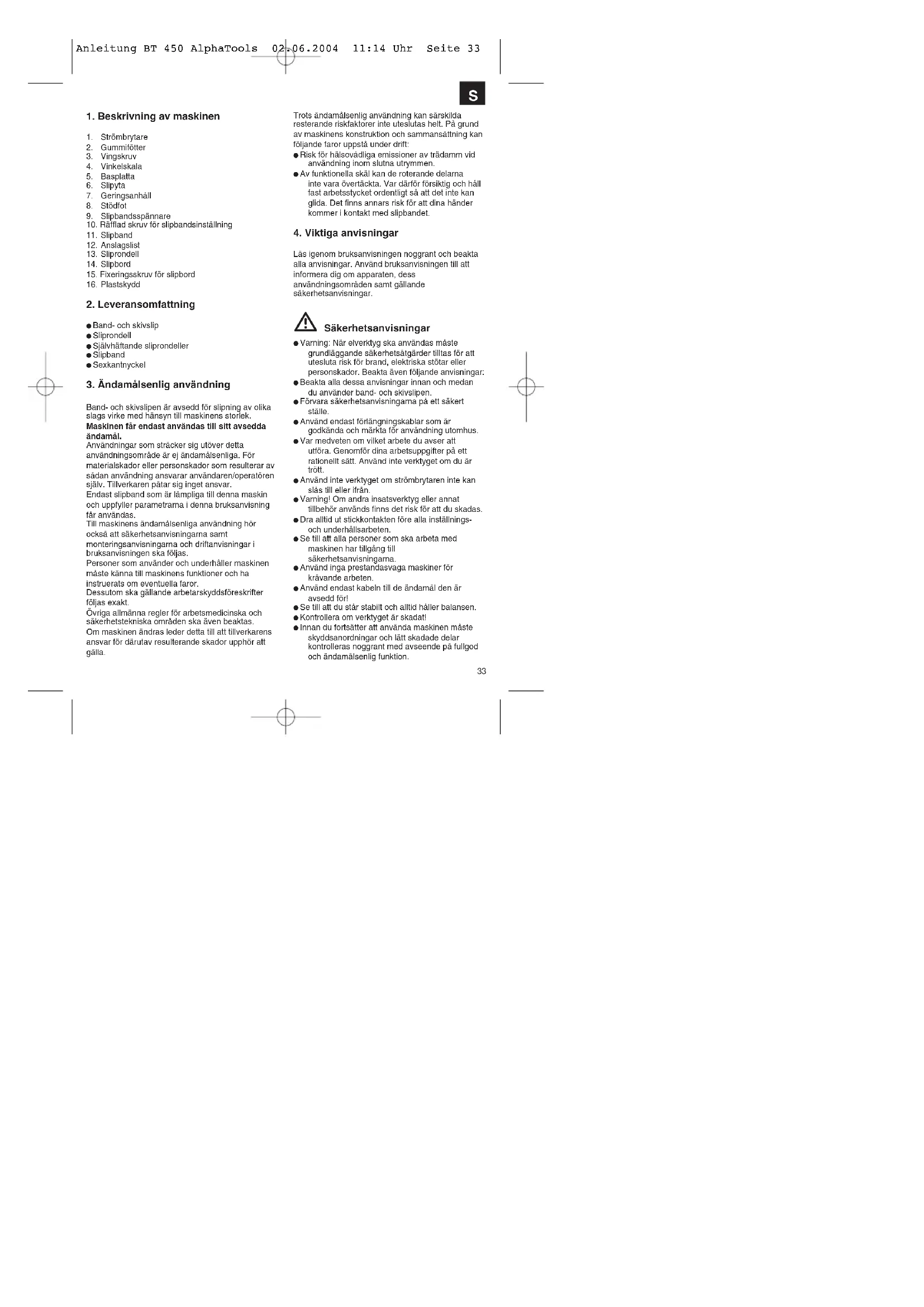 Anleitung BT 450 AlphaTools 02.06.2004 11:14 Uhr Seite 34att spänna fast sliprondellen (13) (bild 3/4). Montera det undre skivskyddet (20) med skruvarna (21) (bild 4). Montera slipbordet (14) och spänn fast med skruven (22) (bild 5). Slipbordet (14) kan ställas in steglöst mellan 0° och 45° med geringsskalan (23) och vingskruven (2). Det justerbara geringsanhållet (7) ska garantera att arbetsstycket kan skjutas fram säkert. Obs! Sliprondellen (13) måste kunna rotera fritt, men samtidigt får avståndet mellan slipbord (14) och sliprondell (13) inte överstiga 1,6 mm. Sätt på anslaglisten (12) och fäst med skruvarna (24) och (25) (bild 6). Obs! Slipbandet (11) måste kunna rotera fritt. 7.2. Byta ut slipband (11) (bild 7 - 9) Dra ut stickkontakten. Skruva ut skruvarna (25) och (26). Ta av skyddet (27) till slipbandet. Flytta slipbandsspännaren (9) åt höger för att spänna av slipbandet (11). Ta av slipbandet (11) bakåt. Montera det nya slipbandet i omvänd ordningsföljd. Obs! Beakta rotationsriktningen: på huset (28) och på slipbandets insida! 7.3. Ställ in slipband (11) (bild 1) Skjut slipbandet (11) långsamt för hand i den avsedda rotationsriktningen. Slipbandet (11) måste löpa i mitten av slipytan (6). Om detta inte stämmer kan bandet justeras in i efterhand med den räfflade skruven (10). 7.4. Justera in slipbandets (11) slipläge (bild 10/11) Lossa på de muttrarna (29). Flytta slipbandet (11) uppåt till det avsedda läget. Dra åt muttrarna (29) på nytt för att fixera detta läge. I detta läge kan slipbordet, som används som underlag till arbetsstycket, sättas in. För detta ändamål måste bordet skjutas in i stödrörets (31) hål och därefter fixeras med skruven (30). 7.5. Byta ut slipplatta på sliprondell (13) Slipplattan för sliprondellen (13) är självhäftande, dvs. den kan enkelt fästas på resp. dras av från sliprondellen (13).