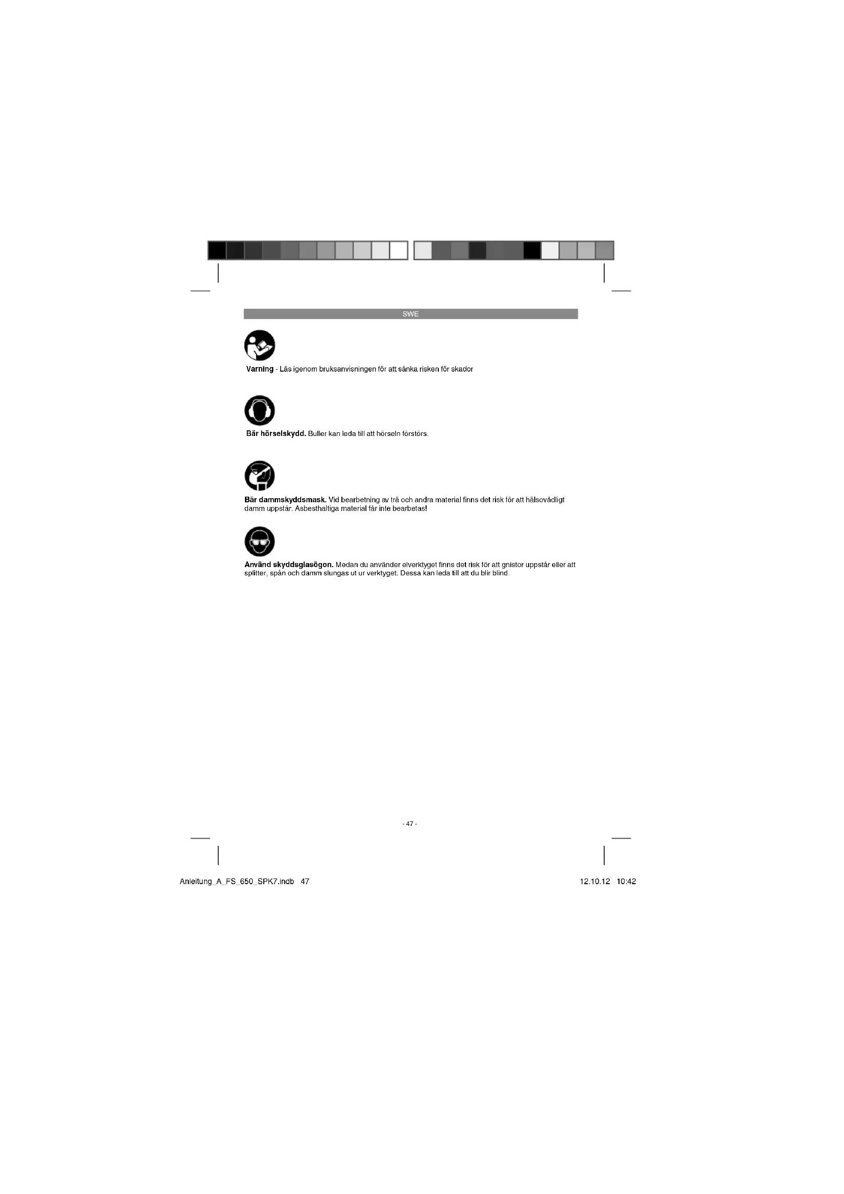 Varning - Läs igenom bruksanvisningen för att sänka risken för skador Bär hörselskydd. Buller kan leda till att hörseln förstörs. Använd skyddsglasögon. Medan du använder elverktyget fi nns det risk för att gnistor uppstår eller att splitter, spån och damm slungas ut ur verktyget. Dessa kan leda till att du blir blind. Bär dammskyddsmask. Vid bearbetning av trä och andra material fi nns det risk för att hälsovådligt damm uppstår. Asbesthaltiga material får inte bearbetas! Anleitung_A_FS_650_SPK7.indb 47Anleitung_A_FS_650_SPK7.indb 47 12.10.12 10:4212.10.12 10:42SWE