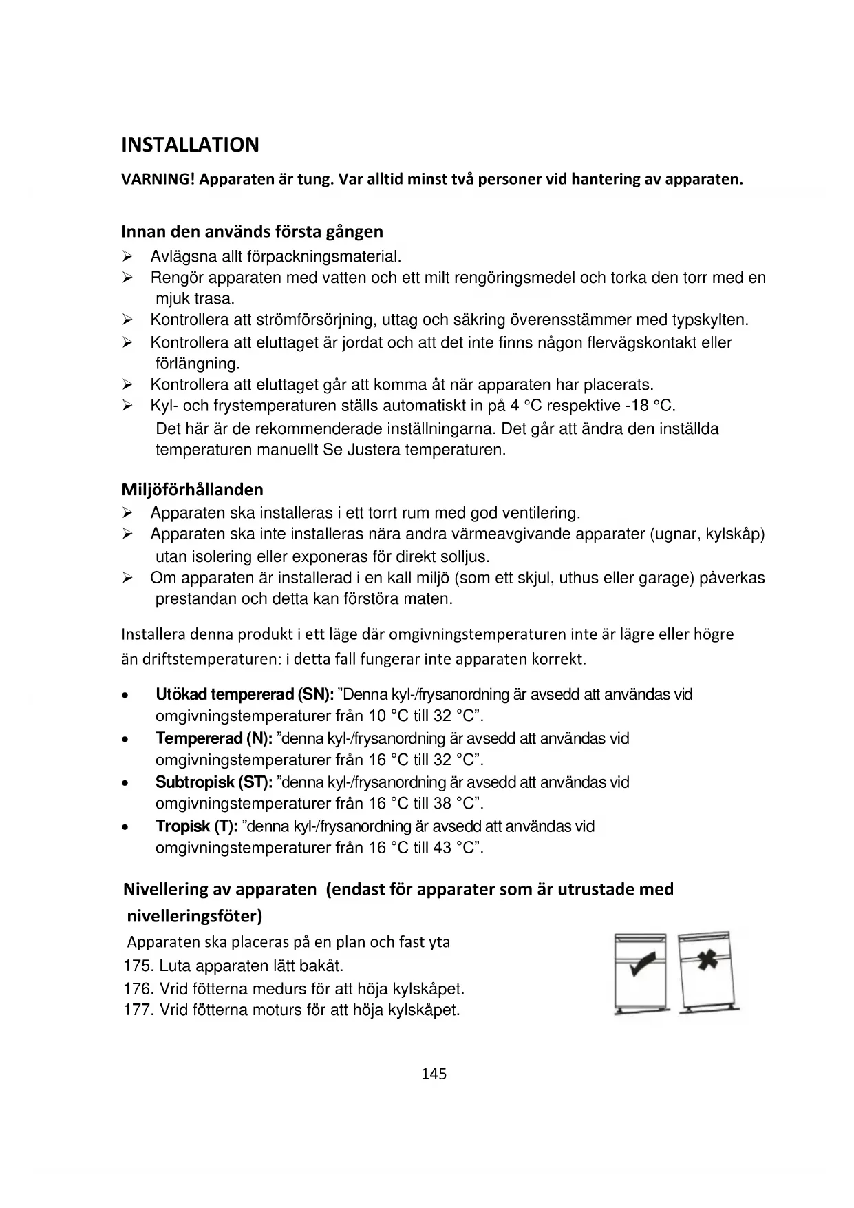 - Tropisk (T): ”denna kyl-/frysanordning är avsedd att användas vid omgivningstemperaturer från 16 °C till 43 °C”. Nivellering av apparaten (endast för apparater som är utrustade med nivelleringsföter) Apparaten ska placeras på en plan och fast yta