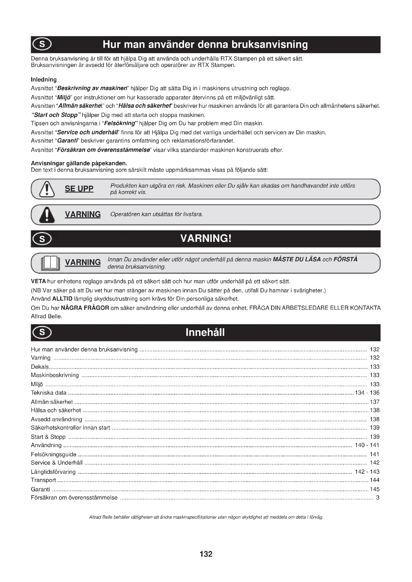 UTILIZZARE SILICONE132 Hur man använder denna bruksanvisning Denna bruksanvisning är till för att hjälpa Dig att använda och underhålla RTX Stampen på ett säkert sätt. Bruksanvisningen är avsedd för återförsäljare och operatörer av RTX Stampen. Inledning Avsnittet “Beskrivning av maskinen” hjälper Dig att sätta Dig in i maskinens utrustning och reglage. Avsnittet “Miljö” ger instruktioner om hur kasserade apparater återvinns på ett miljövänligt sätt. Avsnitten “Allmän säkerhet” och “Hälsa och säkerhet” beskriver hur maskinen används för att garantera Din och allmänhetens säkerhet. “Start och Stopp” hjälper Dig med att starta och stoppa maskinen. Tipsen och anvisningarna i “Felsökning”’ hjälper Dig om Du har problem med Din maskin. Avsnittet “Service och underhåll” ¿ nns för att Hjälpa Dig med det vanliga underhållet och servicen av Din maskin. Avsnittet “Garanti” beskriver garantins omfattning och reklamationsförfarandet. Avsnittet “Försäkran om överensstämmelse” visar vilka standarder maskinen konstruerats efter. Anvisningar gällande påpekanden. Den text i denna bruksanvisning som särskilt måste uppmärksammas visas på följande sätt: Operatören kan utsättas för livsfara. VARNING Produkten kan utgöra en risk. Maskinen eller Du själv kan skadas om handhavandet inte utförs på korrekt vis. SE UPP VETA hur enhetens reglage används på ett säkert sätt och hur man utför underhåll på ett säkert sätt. (NB Var säker på att Du vet hur man stänger av maskinen innan Du sätter på den, utifall Du hamnar i svårigheter.) Använd ALLTID lämplig skyddsutrustning som krävs för Din personliga säkerhet. Om Du har NÅGRA FRÅGOR om säker användning eller underhåll av denna enhet, FRÅGA DIN ARBETSLEDARE ELLER KONTAKTA Altrad Belle. VARNING!