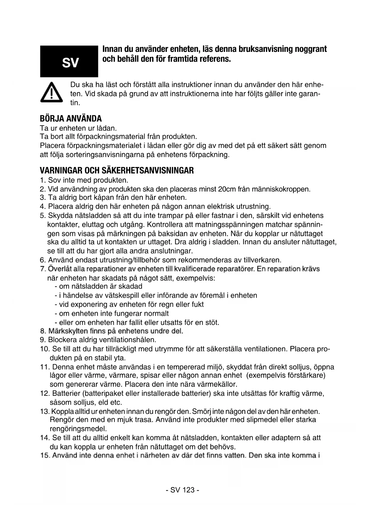 INNAN DU ANVÄNDER ENHETEN, LÄS DENNA BRUKSANVISNING NOGGRANT OCH BEHÅLL DEN FÖR FRAMTIDA REFERENS.- SV 123 - Innan du använder enheten, läs denna bruksanvisning noggrant och behåll den för framtida referens. Du ska ha läst och förstått alla instruktioner innan du använder den här enhe- ten. Vid skada på grund av att instruktionerna inte har följts gäller inte garan- tin.