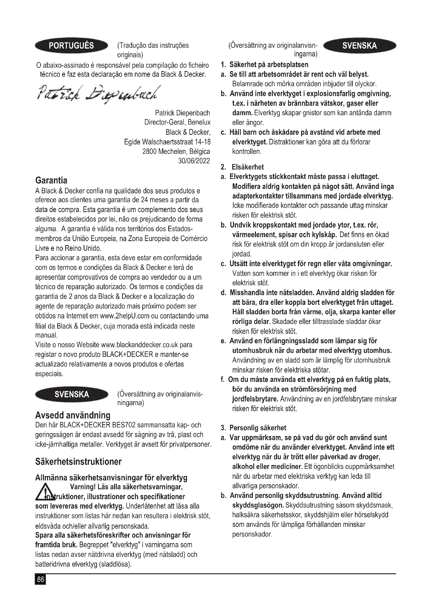 Dessa produkter överensstämmer även med direktiven 2014/30/EU och 2011/65/EU. Kontakta Black & Decker för ytterligare information på följande adress, eller se handbokens baksida. Undertecknad är ansvarig för sammanställningen av tekniska data och gör denna försäkran för Black & Decker. Patrick Diepenbach General Manager, Benelux Black & Decker, Egide Walschaertsstraat 14-18 2800 Mechelen, Belgien 2022-06-30 Garanti Black & Decker är säker på kvaliteten hos denna produkt och erbjuder kunder 24 månaders garanti från inköpsdatumet. Denna garanti är ett tillägg till dina lagstadgade rättigheter och påverkar inte dessa på något sätt. Garantin är giltig i de områden som tillhör medlemsstaterna i Europeiska unionen, det europeiska frihandelsområdet samt Storbritannien. För yrkande under garantin måste yrkandet vara in enlighet med Black & Deckers villkor och du kommer att behöva skicka in bevis på köpet till försäljaren eller en auktoriserad reparatör. Villkoren för Black & Deckers tvååriga garanti och var du hittar din närmaste auktoriserade reparatör kan erhållas på internet på www.2helpU.com, eller genom att kontakta ditt lokal Black & Decker kontor på adressen som angetts i denna bruksanvisning. Besök vår webbplats www.blackanddecker.se för att registrera din nya BLACK & DECKER-produkt samt för att få information om nya produkter och specialerbjudanden.96 (Oversettelse av de opprinnelige instruksjonene) NORSK Tiltenkt bruk Gjæringssagen BLACK+DECKER BES702 er beregnet for å sage tre, plast og ikke-jernholdige metaller. Dette verktøyet er tiltenkt private brukere. Sikkerhetsanvisninger Generelle sikkerhetsadvarsler for elektroverktøy