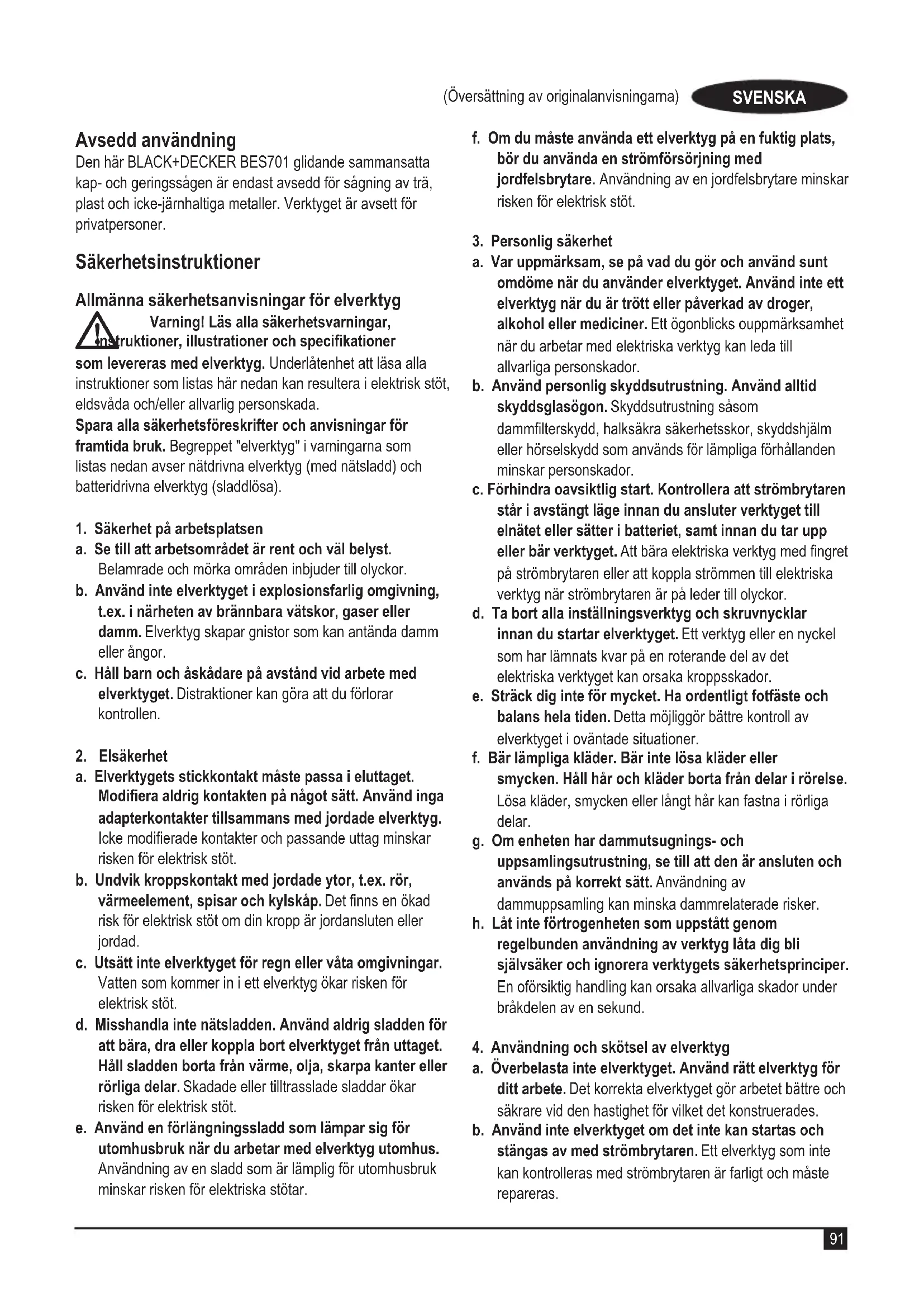 BES701 Glidande sammansatt geringssåg Black & Decker försäkrar att dessa produkter, beskrivna under "tekniska data" uppfyller: 2006/42/EG, EN62841-1:2015, EN 62841-3-9:2020+A11:2020 Dessa produkter överensstämmer även med direktiven 2014/30/EU och 2011/65/EU. Kontakta Black & Decker för ytterligare information på följande adress, eller se handbokens baksida. Undertecknad är ansvarig för sammanställningen av tekniska data och gör denna försäkran för Black & Decker. Patrick Diepenbach General Manager, Benelux Black & Decker, Egide Walschaertsstraat 14-18 2800 Mechelen, Belgien 2022-01-14 Garanti Black & Decker är säker på kvaliteten hos denna produkt och erbjuder kunder 24 månaders garanti från inköpsdatumet. Denna garanti är ett tillägg till dina lagstadgade rättigheter och påverkar inte dessa på något sätt. Garantin är giltig i de områden som tillhör medlemsstaterna i Europeiska unionen, det europeiska frihandelsområdet samt Storbritannien. För yrkande under garantin måste yrkandet vara in enlighet med Black & Deckers villkor och du kommer att behöva skicka in bevis på köpet till försäljaren eller en auktoriserad reparatör. Villkoren för Black & Deckers tvååriga garanti och var du hittar din närmaste auktoriserade reparatör kan erhållas på internet på www.2helpU.com, eller genom att kontakta ditt lokal Black & Decker kontor på adressen som angetts i denna bruksanvisning. Besök vår webbplats www.blackanddecker.se för att registrera din nya BLACK & DECKER-produkt samt för att få information om nya produkter och specialerbjudanden.101 (Oversettelse av de opprinnelige instruksjonene) NORSK Tiltenkt bruk Gjæringssagen BLACK+DECKER BES701, med glidende saghode for kombinert saging, er bare beregnet for å sage tre, plast og ikke-jernholdige metaller. Dette verktøyet er tiltenkt private brukere. Sikkerhetsanvisninger Generelle sikkerhetsadvarsler for elektroverktøy