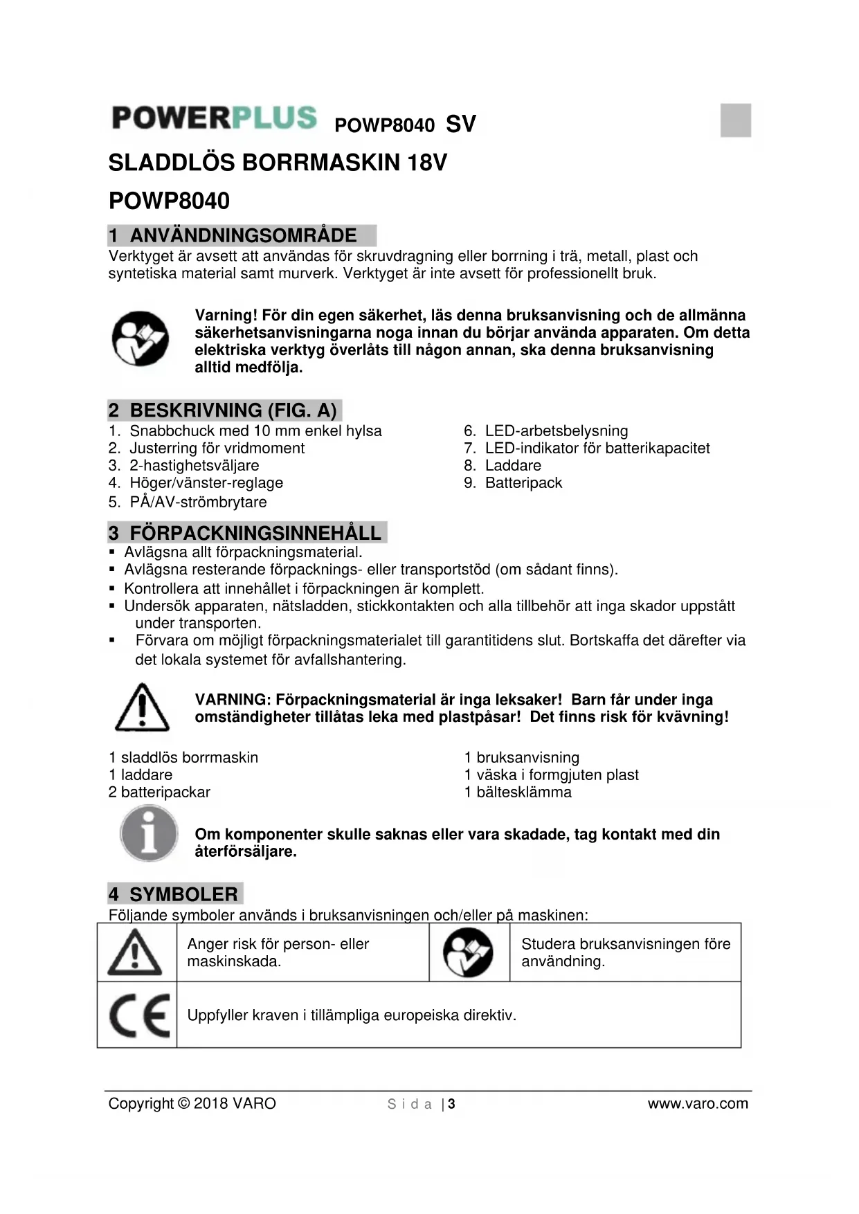 Produkten har ett Li-ion batteri. För att skydda miljön ska batterier deponeras på godkänt sätt för återvinning. I Sverige finns system för insamling och återvinning av batterier och batterier får inte deponeras i det vanliga avfallet. Lokala myndigheter eller din återförsäljare kan ge närmare upplysningar.POWP8040 SV Copyright © 2018 VARO S i d a | 11 www.varo.com