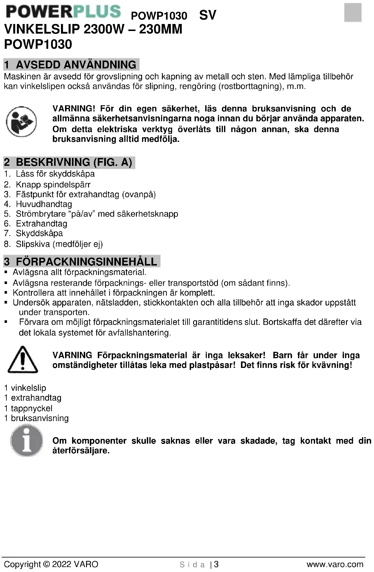- Förvara om möjligt förpackningsmaterialet till garantitidens slut. Bortskaffa det därefter via det lokala systemet för avfallshantering. VARNING Förpackningsmaterial är inga leksaker! Barn får under inga omständigheter tillåtas leka med plastpåsar! Det finns risk för kvävning! 1 vinkelslip 1 extrahandtag 1 tappnyckel 1 bruksanvisning Om komponenter skulle saknas eller vara skadade, tag kontakt med din återförsäljare.POWP1030 SV Copyright © 2022 VARO S i d a | 4 www.varo.com 4 SYMBOLER Följande symboler används i bruksanvisningen och/eller på maskinen: