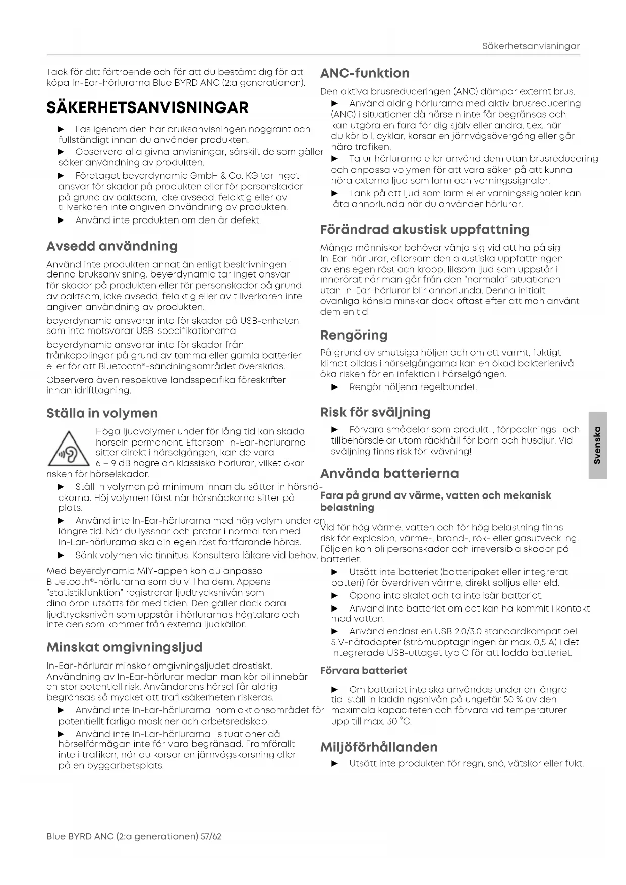 TEKNISKA DATA .......................................62 PRODUKTREGISTRERING .............................. 62 GARANTIVILLKOR ..................................... 62Säkerhetsanvisningar Blue BYRD ANC (2:a generationen) 57/62 Tack för ditt föroende och för att du beämt dig för att köpa In-Ear-hörlurarna Blue BYRD ANC (2:a generationen). SÄKERHETSANVISNINGAR ► Läs igenom den här bruksanvisningen noggrant och fulländigt innan du använder produkten. ► Observera alla givna anvisningar, särskilt de som gäller säker användning av produkten. ► Företaget beyerdynamic GmbH & Co. KG tar inget ansvar för skador på produkten eller för personskador på grund av oaktsam, icke avsedd, felaktig eller av tillverkaren inte angiven användning av produkten. ► Använd inte produkten om den är defekt. Avsedd användning Använd inte produkten annat än enligt beskrivningen i denna bruksanvisning. beyerdynamic tar inget ansvar för skador på produkten eller för personskador på grund av oaktsam, icke avsedd, felaktig eller av tillverkaren inte angiven användning av produkten. beyerdynamic ansvarar inte för skador på USB-enheten, som inte motsvarar USB-specifikationerna. beyerdynamic ansvarar inte för skador från frånkopplingar på grund av tomma eller gamla batterier eller för att Bluetooth®-sändningsområdet överskrids. Observera även respektive landsspecifika föreskrier innan idriagning. Ställa in volymen Höga ljudvolymer under för lång tid kan skada hörseln permanent. Eersom In-Ear-hörlurarna sitter direkt i hörselgången, kan de vara 6–9dB högre än klassiska hörlurar, vilket ökar risken för hörselskador. ► Ställ in volymen på minimum innan du sätter in hörsnä- ckorna. Höj volymen för när hörsnäckorna sitter på plats. ► Använd inte In-Ear-hörlurarna med hög volym under en längre tid. När du lyssnar och pratar i normal ton med In-Ear-hörlurarna ska din egen rö fofarande höras. ► Sänk volymen vid tinnitus. Konsultera läkare vid behov. Med beyerdynamic MIY-appen kan du anpassa Bluetooth®-hörlurarna som du vill ha dem. Appens ”atiikfunktion” regirerar ljudtrycksnivån som dina öron utsätts för med tiden. Den gäller dock bara ljudtrycksnivån som uppår i hörlurarnas högtalare och inte den som kommer från externa ljudkällor. Minskat omgivningsljud In-Ear-hörlurar minskar omgivningsljudet draiskt. Användning av In-Ear-hörlurar medan man kör bil innebär en or potentiell risk. Användarens hörsel får aldrig begränsas så mycket att trafiksäkerheten riskeras. ► Använd inte In-Ear-hörlurarna inom aktionsområdet för potentiellt farliga maskiner och arbetsredskap. ► Använd inte In-Ear-hörlurarna i situationer då hörselförmågan inte får vara begränsad. Framförallt inte i trafiken, när du korsar en järnvägskorsning eller på en byggarbetsplats. ANC-funktion Den aktiva brusreduceringen (ANC) dämpar externt brus. ► Använd aldrig hörlurarna med aktiv brusreducering (ANC) i situationer då hörseln inte får begränsas och kan utgöra en fara för dig själv eller andra, t.ex. när du kör bil, cyklar, korsar en järnvägsövergång eller går nära trafiken. ► Ta ur hörlurarna eller använd dem utan brusreducering och anpassa volymen för att vara säker på att kunna höra externa ljud som larm och varningssignaler. ► Tänk på att ljud som larm eller varningssignaler kan låta annorlunda när du använder hörlurar. Förändrad akuisk uppfattning Många människor behöver vänja sig vid att ha på sig In-Ear-hörlurar, eersom den akuiska uppfattningen av ens egen rö och kropp, liksom ljud som uppår i innerörat när man går från den ”normala” situationen utan In-Ear-hörlurar blir annorlunda. Denna initialt ovanliga känsla minskar dock oa eer att man använt dem en tid. Rengöring På grund av smutsiga höljen och om ett varmt, fuktigt klimat bildas i hörselgångarna kan en ökad bakterienivå öka risken för en infektion i hörselgången. ► Rengör höljena regelbundet. Risk för sväljning ► Förvara smådelar som produkt-, förpacknings- och tillbehörsdelar utom räckhåll för barn och husdjur. Vid sväljning finns risk för kvävning! Använda batterierna Fara på grund av värme, vatten och mekanisk belaning Vid för hög värme, vatten och för hög belaning finns risk för explosion, värme-, brand-, rök- eller gasutveckling. Följden kan bli personskador och irreversibla skador på batteriet. ► Utsätt inte batteriet (batteripaket eller integrerat batteri) för överdriven värme, direkt solljus eller eld. ► Öppna inte skalet och ta inte isär batteriet. ► Använd inte batteriet om det kan ha kommit i kontakt med vatten. ► Använd enda en USB2.0/3.0 andardkompatibel 5V-nätadapter (römupptagningen är max. 0,5A) i det integrerade USB-uttaget typC för att ladda batteriet. Förvara batteriet ► Om batteriet inte ska användas under en längre tid, äll in laddningsnivån på ungefär 50% av den maximala kapaciteten och förvara vid temperaturer upp till max. 30°C. Miljöförhållanden ► Utsätt inte produkten för regn, snö, vätskor eller fukt. SvenskaOm denna bruksanvisning 58/62 Blue BYRD ANC (2:a generationen)