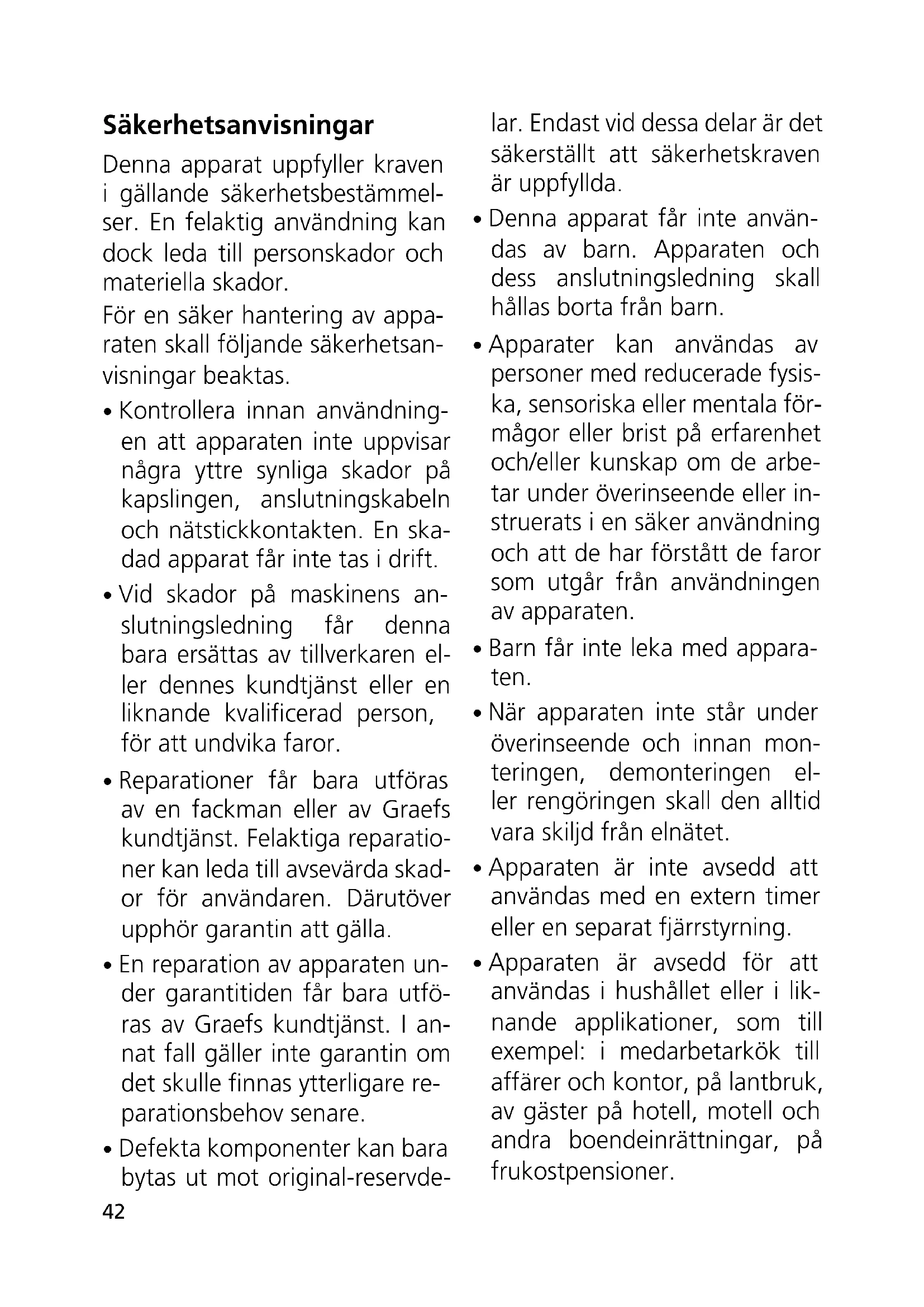 - En reparation av apparaten un- der garantitiden får bara utfö- ras av Graefs kundtjänst. I an- nat fall gäller inte garantin om det skulle nnas ytterligare re- parationsbehov senare.