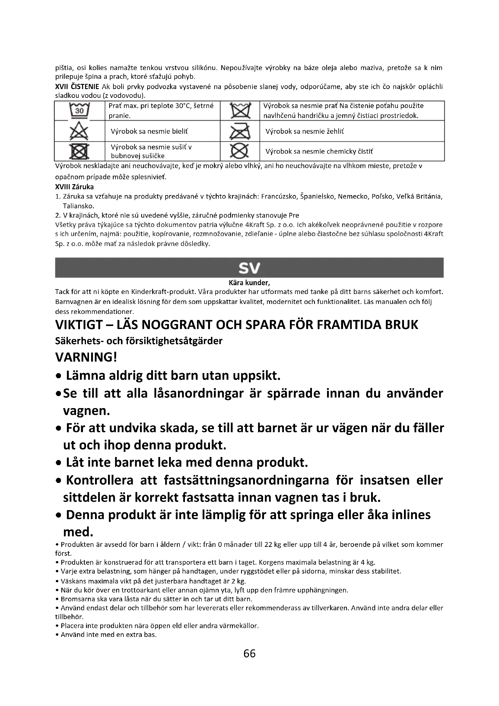 Všetky práva týkajúce sa týchto dokumentov patria výlučne 4Kraft Sp. z o.o. Ich akékoľvek neoprávnené použitie v rozpore s ich určením, najmä: použitie, kopírovanie, rozmnožovanie, zdieľanie - úplne alebo čiastočne bez súhlasu spoločnosti 4Kraft Sp. z o.o. môže mať za následok právne dôsledky. Kära kunder, Tack för att ni köpte en Kinderkraft-produkt. Våra produkter har utformats med tanke på ditt barns säkerhet och komfort. Barnvagnen är en idealisk lösning för dem som uppskattar kvalitet, modernitet och funktionalitet. Läs manualen och följ dess rekommendationer. VIKTIGT – LÄS NOGGRANT OCH SPARA FÖR FRAMTIDA BRUK Säkerhets- och försiktighetsåtgärder VARNING!