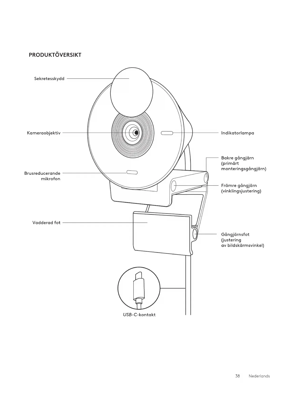 Anslut den medföljande USB-C-kontakten till motsvarande port på datorn. Om möjligt rekommenderar vi att du kopplar in Brio 300 direkt i datorn och inte via en USB-hubb. 40NederlandsÖPPNA SEKRETESSKYDDET Öppna sekretesskyddet genom att trycka försiktigt på det från vänster eller höger riktning på enheten. Luckan hamnar in i avstängt läge ovanför kameran. INSTALLERA TUNE Logi Tune hjälper till att öka prestandan iwebbkameran genom periodiska uppdateringar av programvara och inbyggd programvara. Vi rekommenderar att du uppdaterar webbkameran och drar nytta av de fantastiska funktionerna i Brio 300. Ladda ner Logi Tune från www.logitech.com/tune för att göra det Logi Tune Webbkamera: Höjd x bredd x djup: 65,63 mm (2,58 tum) x 53,1 mm (2,09 tum) x 45 mm (1,78 tum), inkl. monteringsklämma Produktvikt: 74,6 g (2,63uns), inklusive monteringsklämma och sladd Längd på fastsatt sladd: 1,5m (5fot) MÅTT 41Nederlands© 2023 Logitech. Logitech, Logi och Logitechs logotyp är varumärken eller registrerade varumärkensom tillhör Logitech Europe S.A. och/eller dess dotterbolag i USA och andra länder. USB-C och alla övriga varumärken tillhör respektive ägare. Logitech påtar sig inget ansvar för eventuella fel som kan förekomma i denna bruksanvisning. Informationen häri kan ändras utan föregående meddelande. www.logitech.com/support/Brio300OVERSIGT OVER PRODUKTET LED-indikatorlys Hængsel foran (justering af hældning) Fodhængsel (justering af skærmens vinkel) Baghængsel (primær monteringshængsel) Lukker som dækker kameraets objektiv Kameraobjektiv Støjreducerende mikrofon Polstret fod USB-C-tilslutning 43 DanskUSB-C KASSEN INDEHOLDER