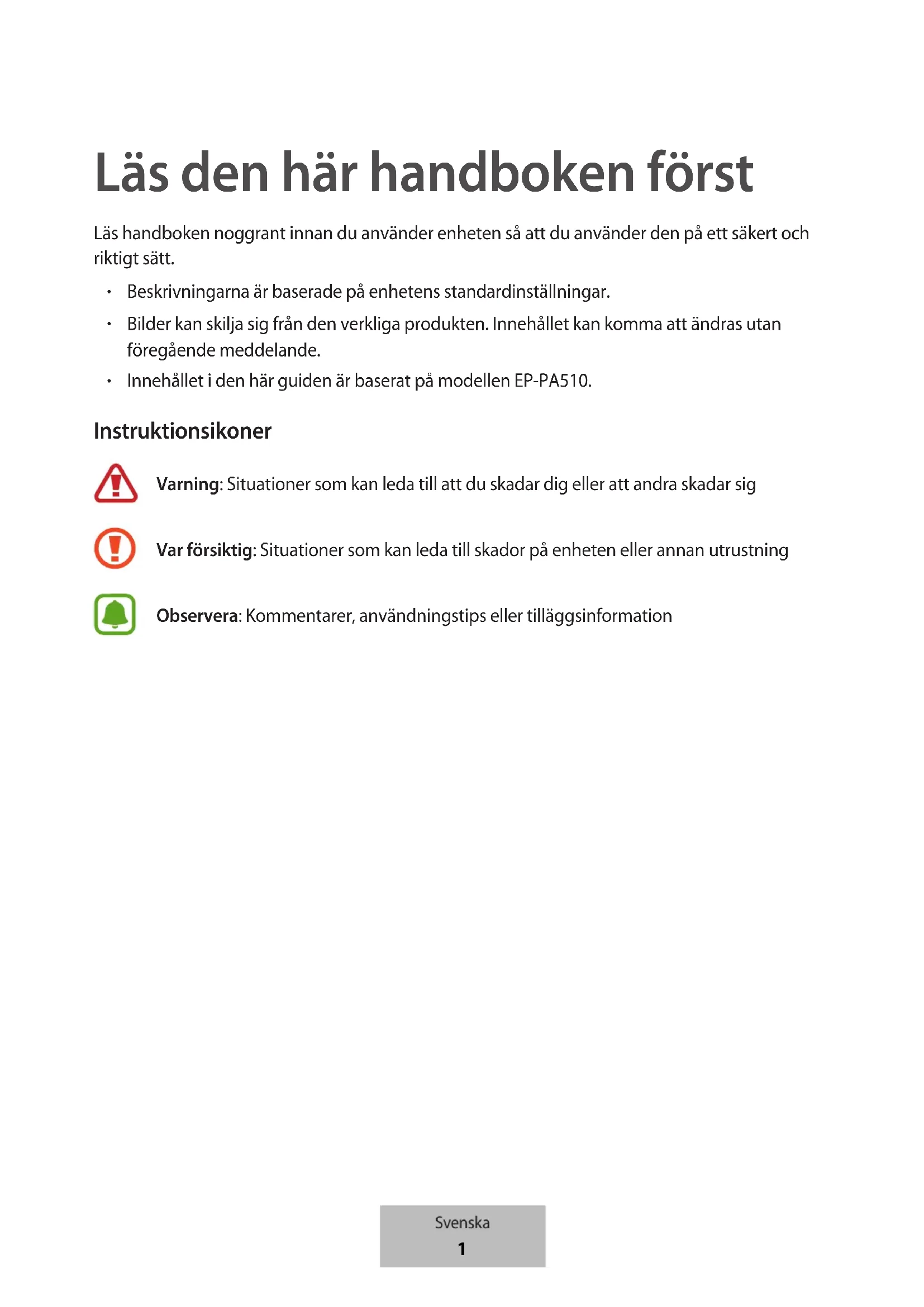 Innehållet i den här guiden är baserat på modellen EP-PA510. Instruktionsikoner Varning: Situationer som kan leda till att du skadar dig eller att andra skadar sig Var försiktig: Situationer som kan leda till skador på enheten eller annan utrustning Observera: Kommentarer, användningstips eller tilläggsinformation Svenska