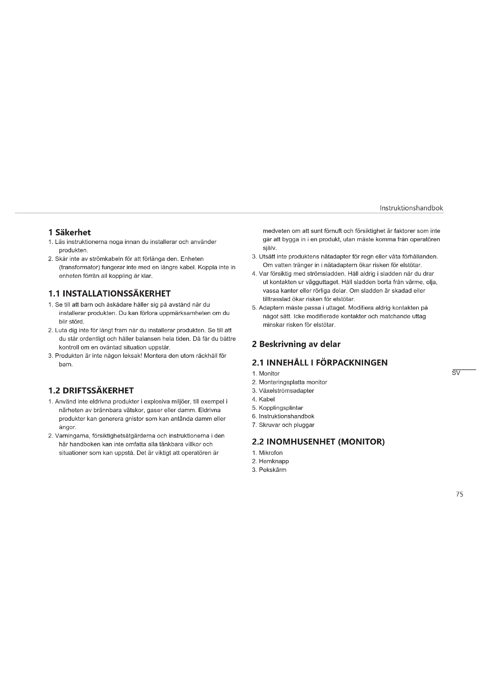 - Använd lämpliga tillbehör med specifikationerna 12 V och 500mA. Installera endast lås med ett mekaniskt lagringssystem. SVInstruktionshandbok