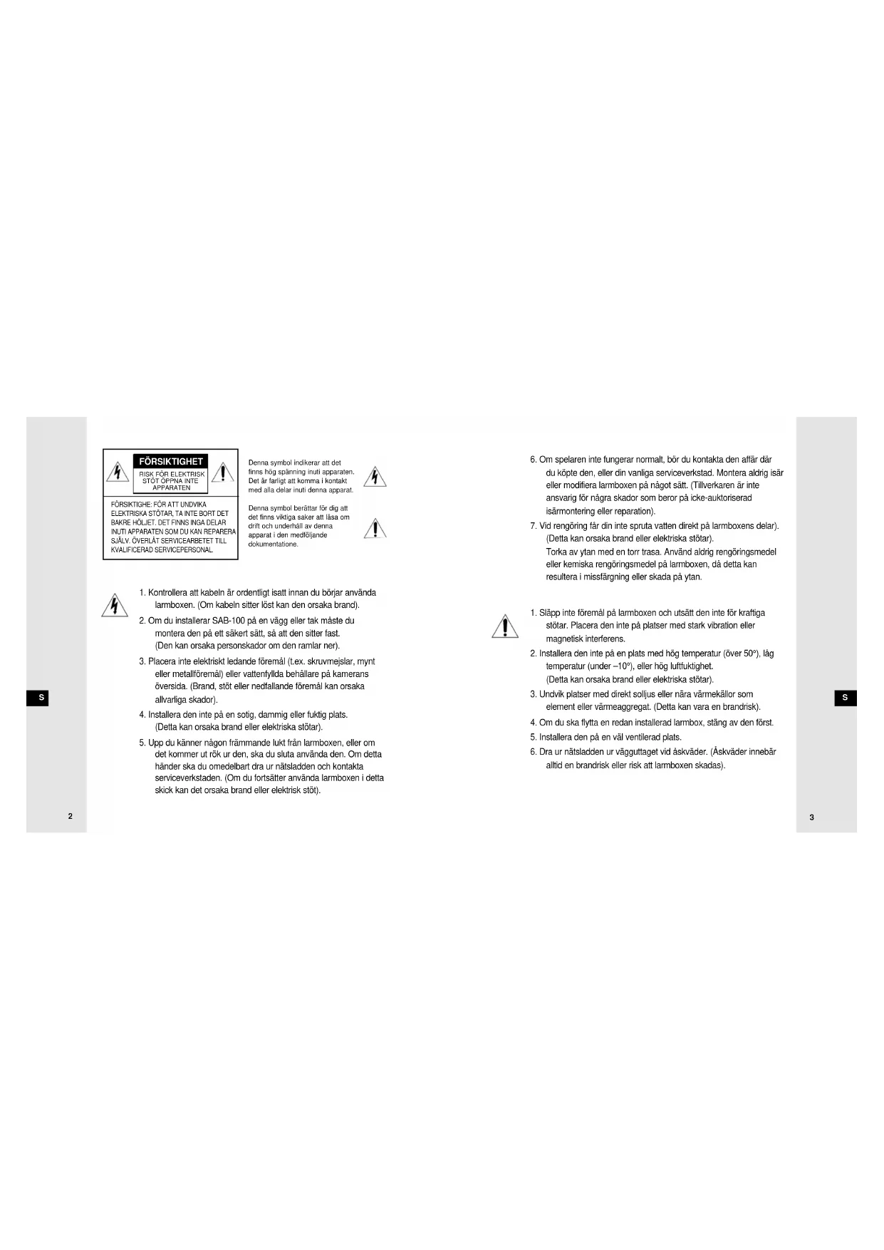det kommer ut rök ur den, ska du sluta använda den. Om detta händer ska du omedelbart dra ur nätsladden och kontakta serviceverkstaden. (Om du fortsätter använda larmboxen i detta skick kan det orsaka brand eller elektrisk stöt). Denna symbol indikerar att det finns hög spänning inuti apparaten. Det är farligt att komma i kontakt med alla delar inuti denna apparat. Denna symbol berättar för dig att det finns viktiga saker att läsa om drift och underhåll av denna apparat i den medföljande dokumentatione.