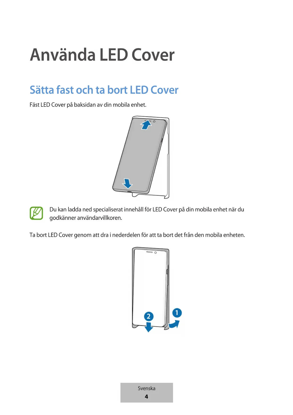 Använda LED Cover Sätta fast och ta bort LED Cover Fäst LED Cover på baksidan av din mobila enhet. Du kan ladda ned specialiserat innehåll för LED Cover på din mobila enhet när du godkänner användarvillkoren. Ta bort LED Cover genom att dra i nederdelen för att ta bort det från den mobila enheten.