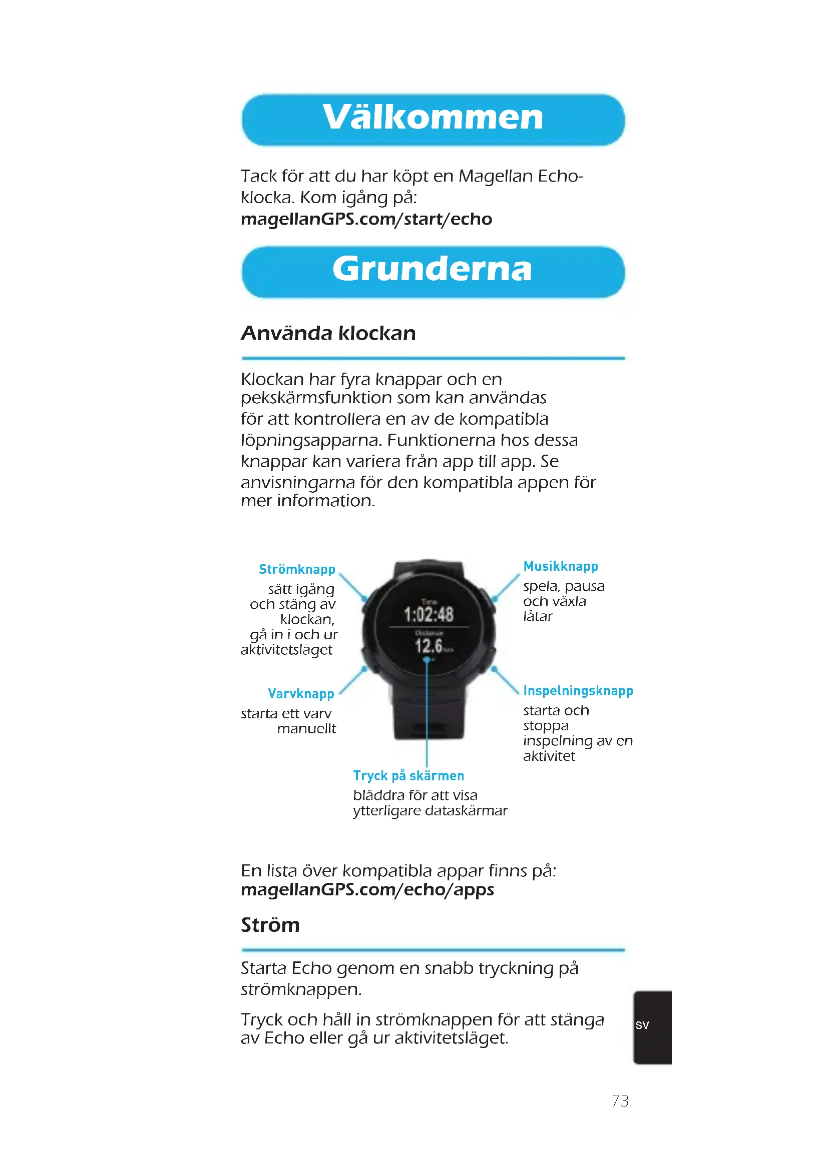 Välkommen Tack för att du har köpt en Magellan Echo- klocka. Kom igång på: magellanGPS.com/start/echo Grunderna Använda klockan Klockan har fyra knappar och en pekskärmsfunktion som kan användas för att kontrollera en av de kompatibla löpningsapparna. Funktionerna hos dessa knappar kan variera från app till app. Se anvisningarna för den kompatibla appen för mer information. Inspelningsknapp starta och stoppa inspelning av en aktivitet Musikknapp spela, pausa och växla låtar Strömknapp sätt igång och stäng av klockan, gå in i och ur aktivitetsläget Varvknapp starta ett varv manuellt Tryck på skärmen bläddra för att visa ytterligare dataskärmar En lista över kompatibla appar finns på: magellanGPS.com/echo/apps Ström Starta Echo genom en snabb tryckning på strömknappen. Tryck och håll in strömknappen för att stänga av Echo eller gå ur aktivitetsläget.74