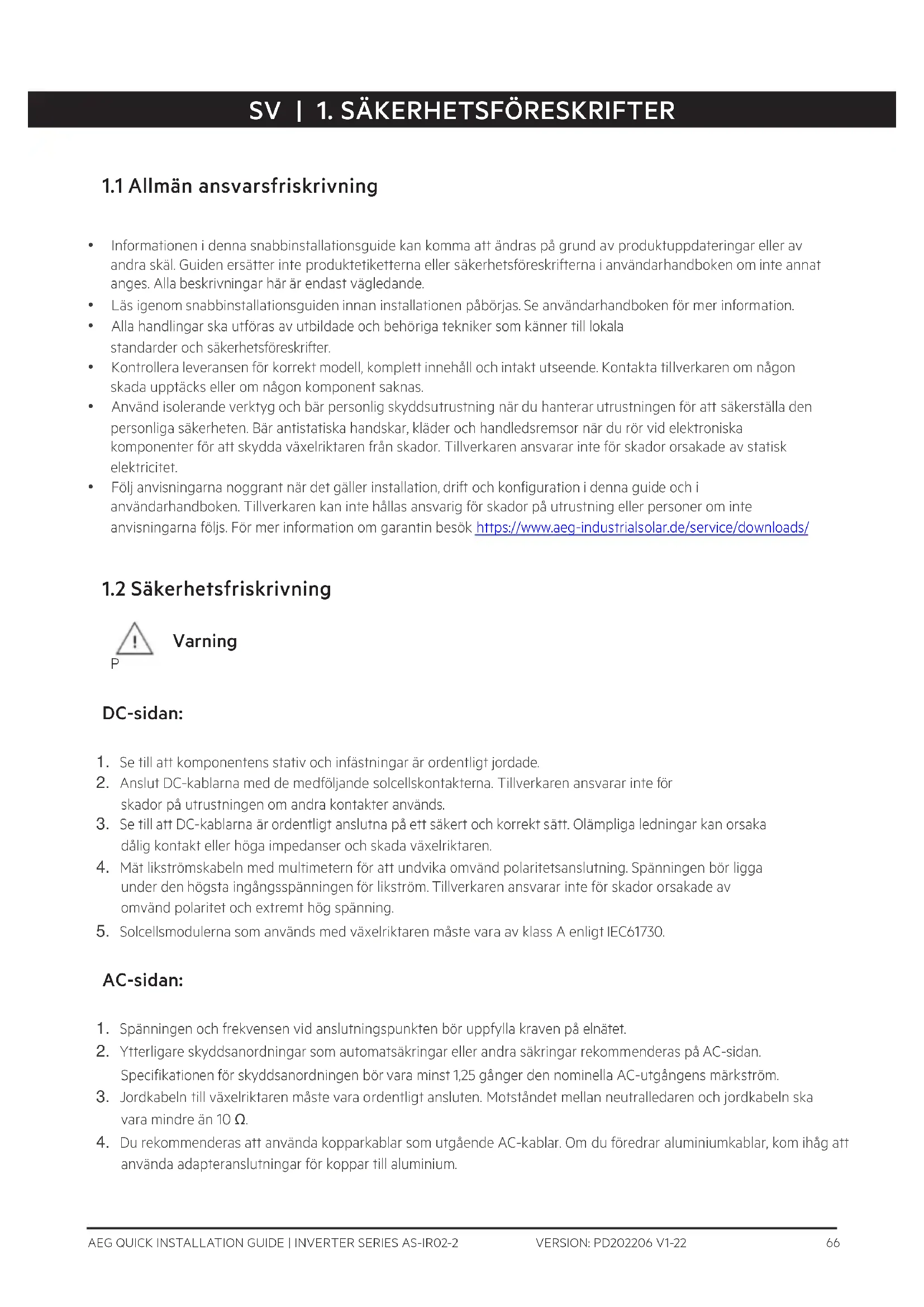 - Följ anvisningarna noggrant när det gäller installation, drift och konfiguration i denna guide och i användarhandboken. Tillverkaren kan inte hållas ansvarig för skador på utrustning eller personer om inte anvisningarna följs. För mer information om garantin besök https://www.aeg-industrialsolar.de/service/downloads/