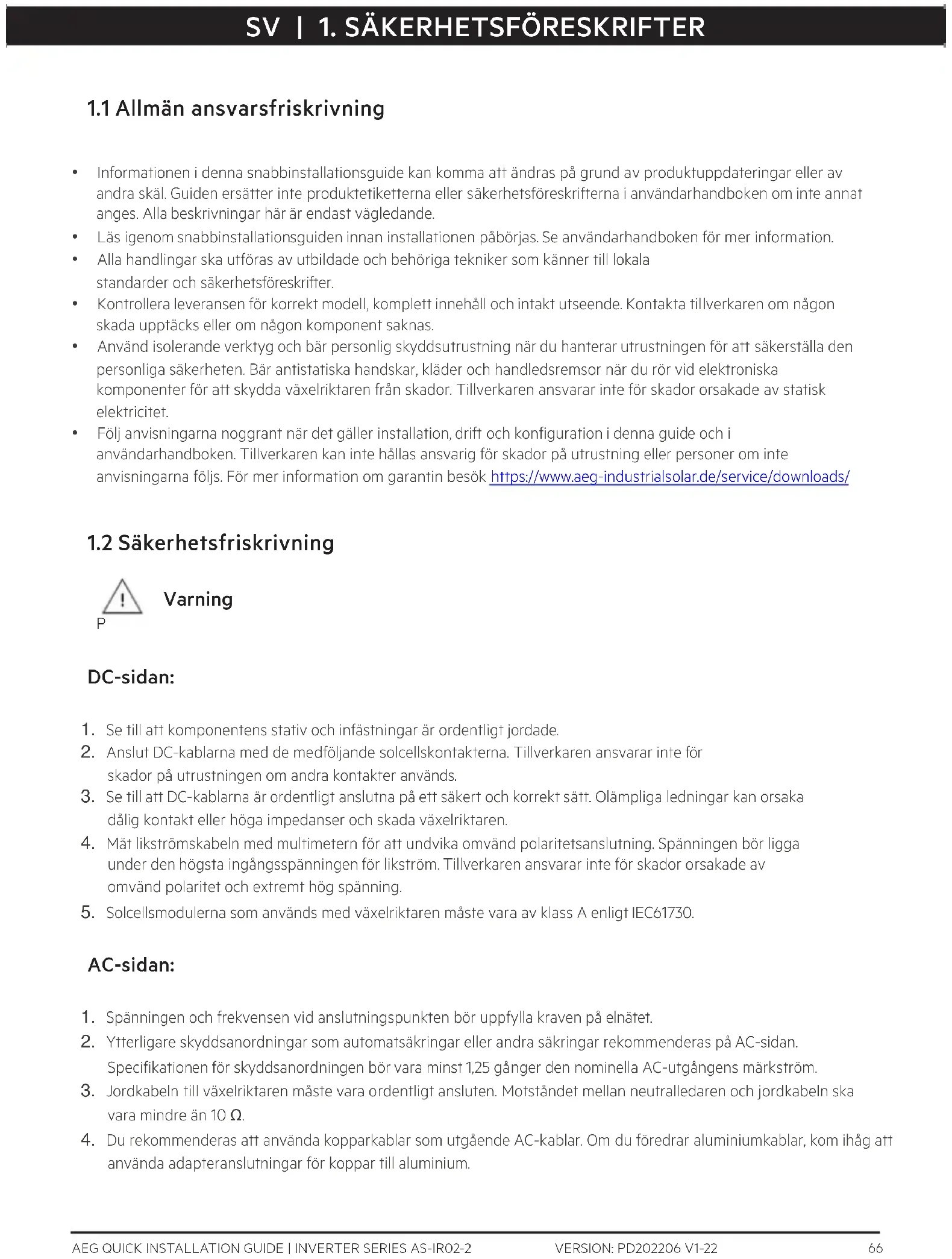 - Följ anvisningarna noggrant när det gäller installation, drift och konfiguration i denna guide och i användarhandboken. Tillverkaren kan inte hållas ansvarig för skador på utrustning eller personer om inte anvisningarna följs. För mer information om garantin besök https://www.aeg-industrialsolar.de/service/downloads/
