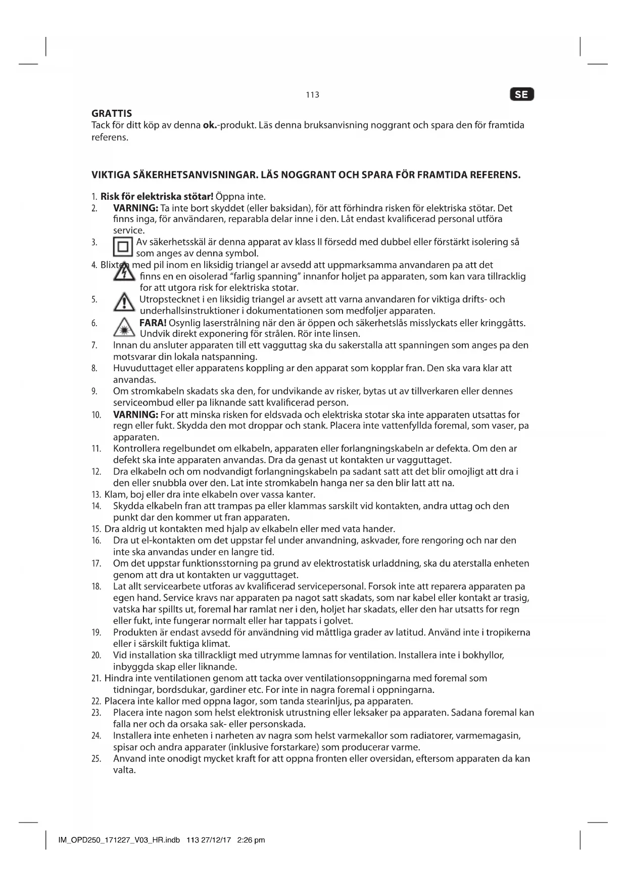 SPECIFIKATION DISPLAYFUNKTIONER Videostandard NTSC/PAL Skivor kompatibilitet MPEG4, DVD, DVD+/-R/RW, VCD, JPEG. CD-DA, CD-R, CD-RW VIDEO UT Video ut 1.0 V (p-p) / 75 Q, synk. negativ polaritet LJUD UT Ljud utgående nivå 2 V rms -1/+0.2 Frekvenssvar 20 Hz till 20 kHz S/N förhållande > 90 dB Total harmonisk distorsion < 0.025 % EFFEKTKRAV Ingående ström 100 - 240 V~, 50/60 Hz Strömförbrukning < 8 W ANSLUTNINGAR Ingång USB 1 Utgång R/L 1 SCART 1 Video 1 HDMI 1 AVYTTRING Denna apparat får inte kastas med hushållsavfallet. Lämna in den på återvinningsstationen för återvinning av elektroniskt och elektriskt avfall. Genom att göra detta hjälper du till att bevara resurserna och skydda miljön. Kontakta din återförsäljare eller lokala myndigheter för mer information. Gör dig av med batterierna på ett miljövänligt sätt. Släng inte batterier i hushållssoporna. Använd återvinnings och uppsamlingssystemet i din kommun eller kontakta den återförsäljare där du köpte produkten. IM_OPD250_171227_V03_HR.indb 122 27/12/17 2:26 pm123