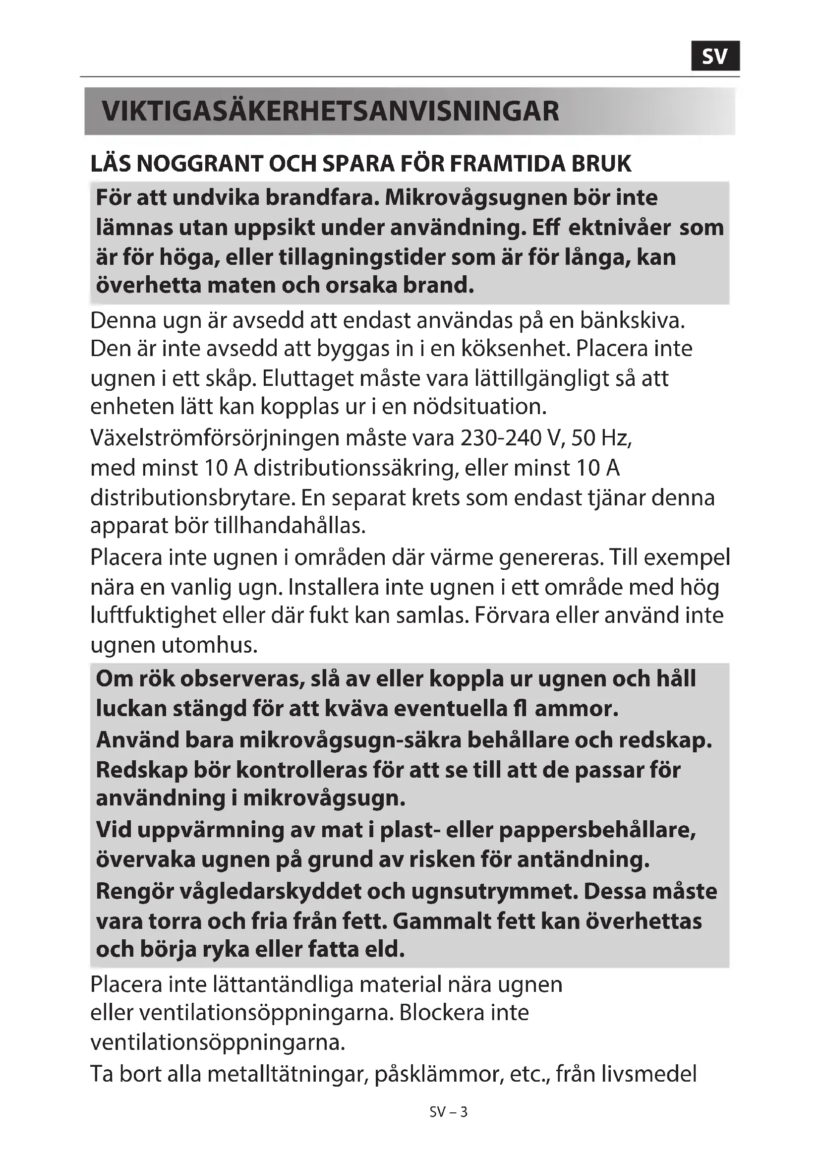 LÄS NOGGRANT OCH SPARA FÖR FRAMTIDA BRUK För att undvika brandfara. Mikrovågsugnen bör inte lämnas utan uppsikt under användning. E ektnivåer som är för höga, eller tillagningstider som är för långa, kan överhetta maten och orsaka brand. Denna ugn är avsedd att endast användas på en bänkskiva. Den är inte avsedd att byggas in i en köksenhet. Placera inte ugnen i ett skåp. Eluttaget måste vara lättillgängligt så att enheten lätt kan kopplas ur i en nödsituation. Växelströmförsörjningen måste vara 230-240 V, 50 Hz, med minst 10 A distributionssäkring, eller minst 10 A distributionsbrytare. En separat krets som endast tjänar denna apparat bör tillhandahållas. Placera inte ugnen i områden där värme genereras. Till exempel nära en vanlig ugn. Installera inte ugnen i ett område med hög luftfuktighet eller där fukt kan samlas. Förvara eller använd inte ugnen utomhus. Om rök observeras, slå av eller koppla ur ugnen och håll luckan stängd för att kväva eventuella ammor. Använd bara mikrovågsugn-säkra behållare och redskap. Redskap bör kontrolleras för att se till att de passar för användning i mikrovågsugn. Vid uppvärmning av mat i plast- eller pappersbehållare, övervaka ugnen på grund av risken för antändning. Rengör vågledarskyddet och ugnsutrymmet. Dessa måste vara torra och fria från fett. Gammalt fett kan överhettas och börja ryka eller fatta eld. Placera inte lättantändliga material nära ugnen eller ventilationsöppningarna. Blockera inte ventilationsöppningarna. Ta bort alla metalltätningar, påsklämmor, etc., från livsmedelSV – 4SV – 4 och förpackningar. Gnista på metallytor kan orsaka brand. Använd inte mikrovågsugnen för att värma olja till fritering. Temperaturen kan inte kontrolleras och oljan kan fatta eld. För att göra popcorn, använd bara speciella mikrovågsugnpopcornstillverkare. Förvara inte mat eller andra föremål inuti ugnen. Kontrollera inställningarna när du startar ugnen för att säkerställa att ugnen fungerar som du önskar. Lämna inte ugnen utan uppsikt medan den är igång. För att undvika överhettning och brand måste särskild försiktighet iakttas vid matlagning eller uppvärmning av mat med hög socker- eller fetthalt, t ex korvar, pajer eller puddingar. Se motsvarande tips i bruksanvisningen. För att undvika möjligheten för skada. VARNING: Använd inte ugnen om den är skadad eller inte fungerar. Kontrollera följande före användning: a) Se till att luckan stängs ordentligt och att den inte är feljusterad eller skev. b) Kontrollera att gångjärnen och säkerhetslucklåsen inte är trasiga eller lösa. c) Se till att dörrtätningarna och tätningsytorna inte har skadats. d) Se till att det inte nns några bucklor inuti ugnsutrymmet eller på luckan. e) Se till att strömkabeln och kontakten inte är skadade. Om luckan eller tätningar är skadade, får ugnen inte användas förrän den har reparerats av en behörig person. Justera aldrig, reparera eller ändra ugnen själv. Det är farligt för andra än en behörig person att utföra service eller reparation som innefattar borttagande av ett hölje som skyddar mot exponering av mikrovågor. Använd inte ugnen med dörren öppen eller ändra luckans säkerhetslås på något sätt. Använd inte ugnen om det nns SV – 5SV SV – 4 SV – 5SV – 5 något föremål mellan lucktätningen och tätningsytorna. Låt inte fett eller smuts samlas på luckans tätningar och närliggande delar. Rengör ugnen med jämna mellanrum och ta bort eventuella matrester. Följ instruktionerna för “Skötsel och rengöring”. Underlåtenhet att hålla ugnen ren kan leda till en försämring av ytan vilket kan negativt påverka livslängden för enheten och möjligen resultera i en farlig situation. Personer med PACEMAKER bör kontrollera med sin läkare eller tillverkaren av pacemakern om försiktighetsåtgärder beträ ande mikrovågsugnar. För att undvika risken för elektriska stötar.