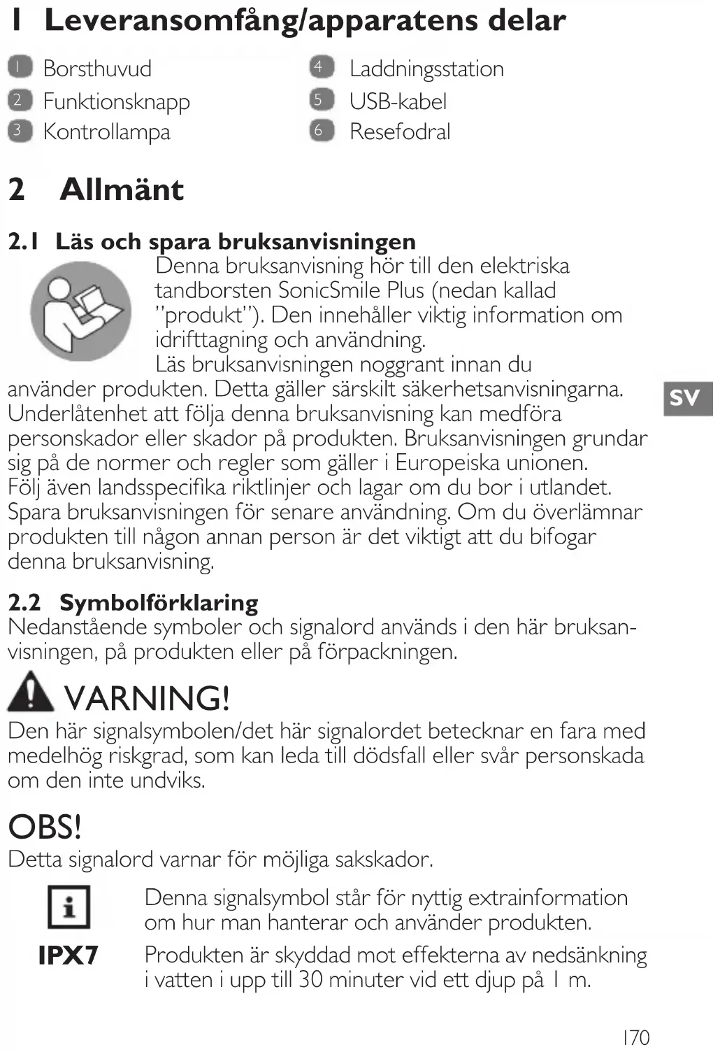 Nedanstående symboler och signalord används i den här bruksan- visningen, på produkten eller på förpackningen. VARNING! Den här signalsymbolen/det här signalordet betecknar en fara med medelhög riskgrad, som kan leda till dödsfall eller svår personskada om den inte undviks. OBS! Detta signalord varnar för möjliga sakskador. Denna signalsymbol står för nyttig extrainformation om hur man hanterar och använder produkten. IPX7 Produkten är skyddad mot effekterna av nedsänkning i vatten i upp till 30minuter vid ett djup på 1m.171