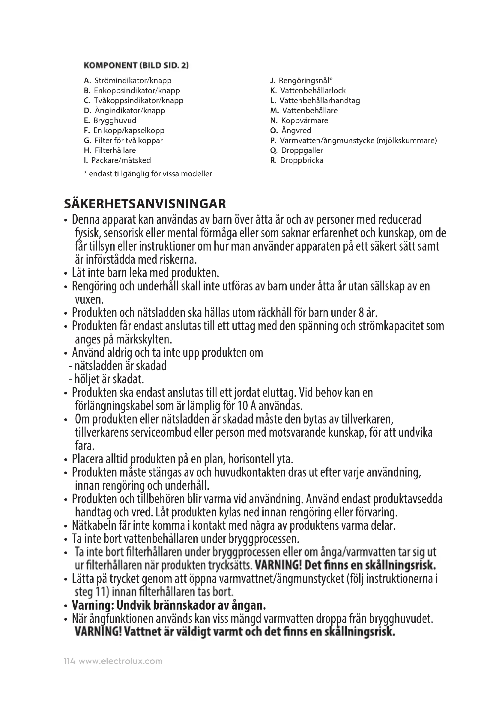 - När ångfunktionen används kan viss mängd varmvatten droppa från brygghuvudet.115www.electrolux.com
