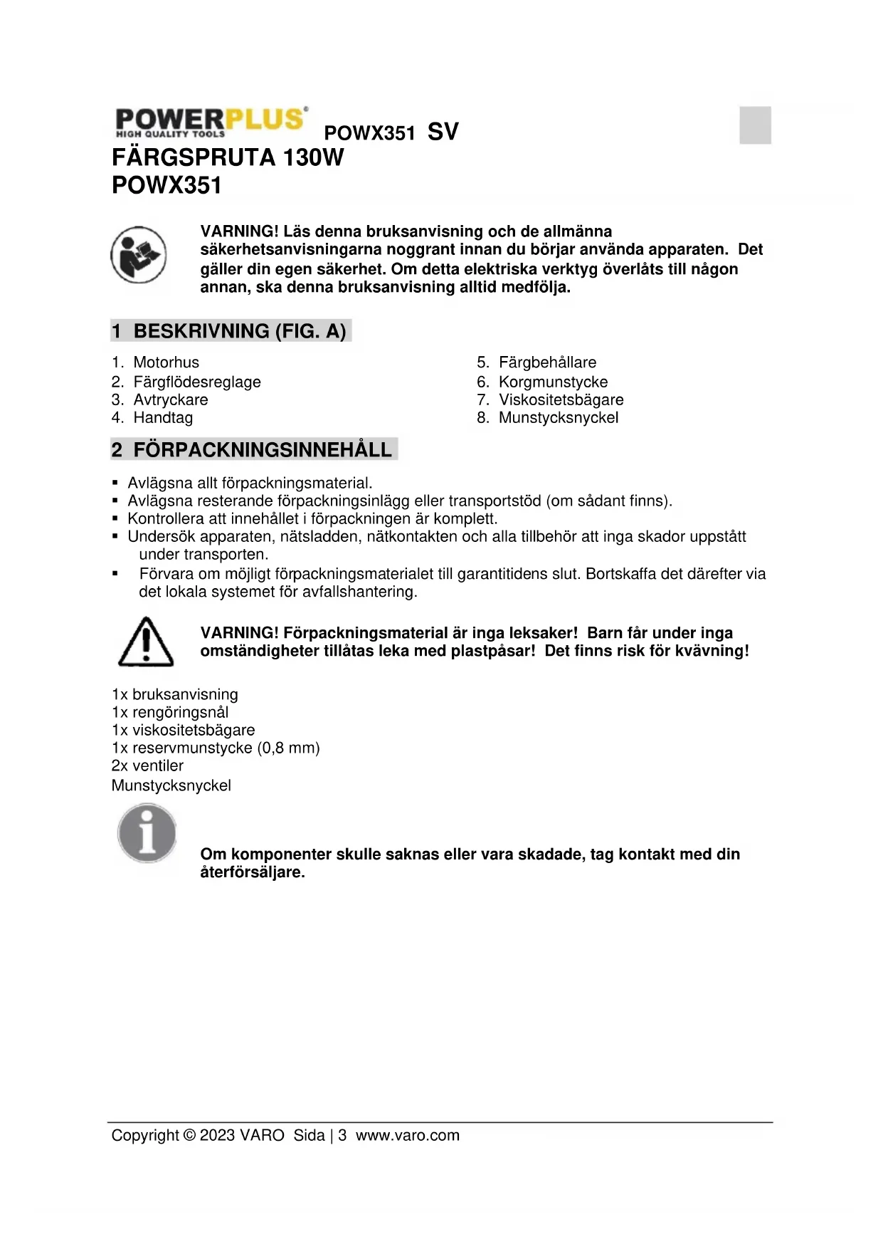 - Förvara om möjligt förpackningsmaterialet till garantitidens slut. Bortskaffa det därefter via det lokala systemet för avfallshantering. VARNING! Förpackningsmaterial är inga leksaker! Barn får under inga omständigheter tillåtas leka med plastpåsar! Det finns risk för kvävning! 1x bruksanvisning 1x rengöringsnål 1x viskositetsbägare 1x reservmunstycke (0,8 mm) 2x ventiler Munstycksnyckel Om komponenter skulle saknas eller vara skadade, tag kontakt med din återförsäljare.POWX351 SV Copyright © 2023 VARO Sida | 4 www.varo.com 3 SYMBOLER Följande symboler används i bruksanvisningen och/eller på maskinen:
