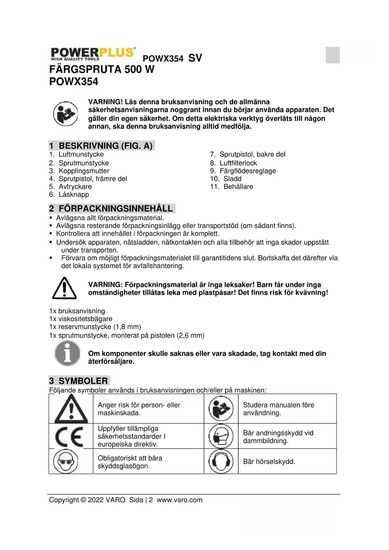 - SKYDDA ÖRONEN - Använd hörselskydd om bullernivån överstiger 85 dB(A).POWX354 SV Copyright © 2022 VARO Sida | 5 www.varo.com