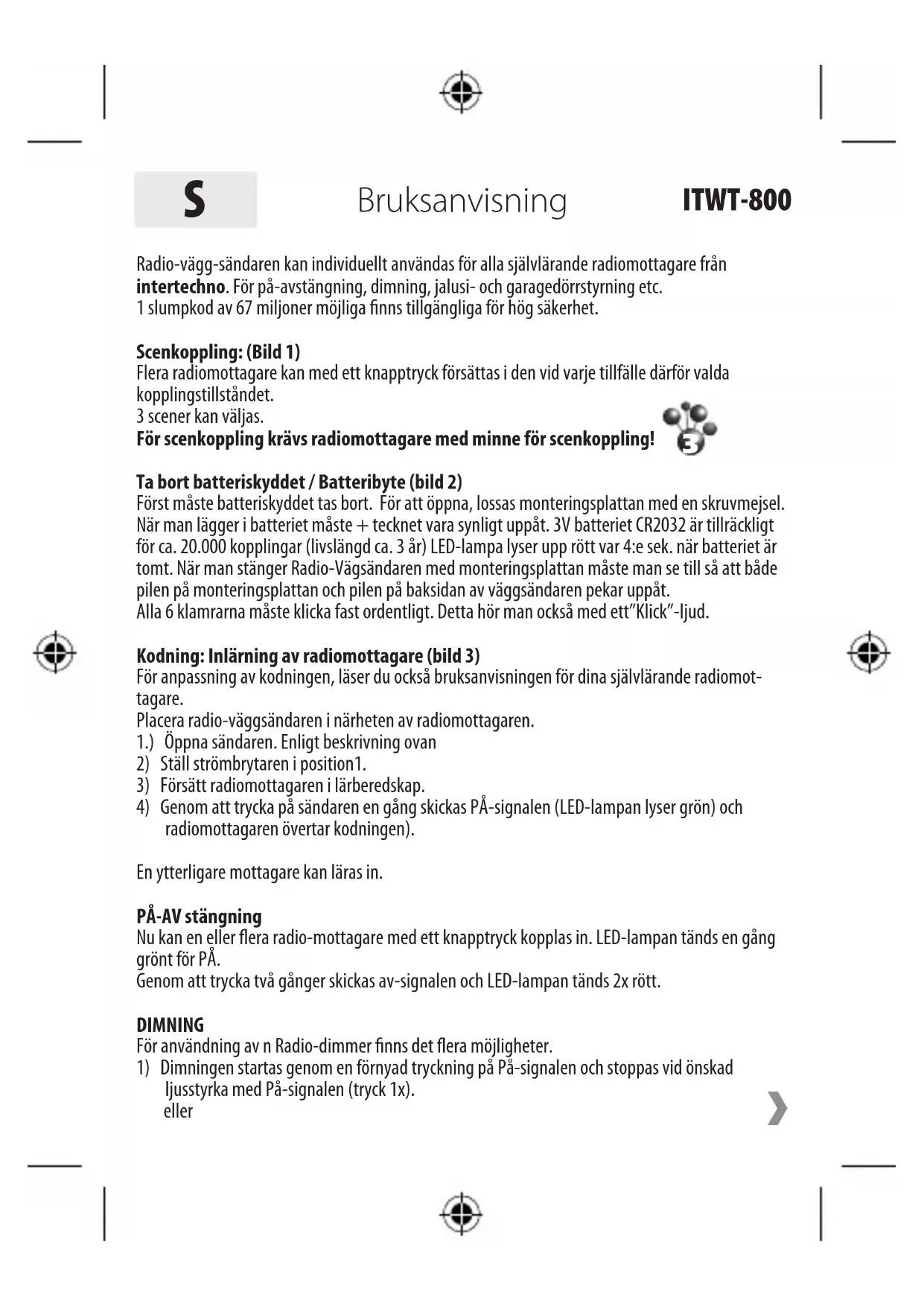 ITWT-800Radio-vägg-sändaren kan individuellt användas för alla självlärande radiomottagare från intertechno. För på-avstängning, dimning, jalusi- och garagedörrstyrning etc. 1 slumpkod av 67 miljoner möjliga finns tillgängliga för hög säkerhet. Scenkoppling: (Bild 1)Flera radiomottagare kan med ett knapptryck försättas i den vid varje tillfälle därför valda kopplingstillståndet.3 scener kan väljas. För scenkoppling krävs radiomottagare med minne för scenkoppling! Ta bort batteriskyddet / Batteribyte (bild 2)Först måste batteriskyddet tas bort. För att öppna, lossas monteringsplattan med en skruvmejsel.När man lägger i batteriet måste + tecknet vara synligt uppåt. 3V batteriet CR2032 är tillräckligt för ca. 20.000 kopplingar (livslängd ca. 3 år) LED-lampa lyser upp rött var 4:e sek. när batteriet är tomt. När man stänger Radio-Vägsändaren med monteringsplattan måste man se till så att både pilen på monteringsplattan och pilen på baksidan av väggsändaren pekar uppåt.Alla 6 klamrarna måste klicka fast ordentligt. Detta hör man också med ett”Klick”-ljud.Kodning: Inlärning av radiomottagare (bild 3)För anpassning av kodningen, läser du också bruksanvisningen för dina självlärande radiomot-tagare.Placera radio-väggsändaren i närheten av radiomottagaren.1.) Öppna sändaren. Enligt beskrivning ovan 2) Ställ strömbrytaren i position1.3) Försätt radiomottagaren i lärberedskap.4) Genom att trycka på sändaren en gång skickas PÅ-signalen (LED-lampan lyser grön) och radiomottagaren övertar kodningen).En ytterligare mottagare kan läras in.PÅ-AV stängningNu kan en eller flera radio-mottagare med ett knapptryck kopplas in. LED-lampan tänds en gång grönt för PÅ. Genom att trycka två gånger skickas av-signalen och LED-lampan tänds 2x rött.DIMNINGFör användning av n Radio-dimmer finns det flera möjligheter. 1) Dimningen startas genom en förnyad tryckning på På-signalen och stoppas vid önskad ljusstyrka med På-signalen (tryck 1x). eller